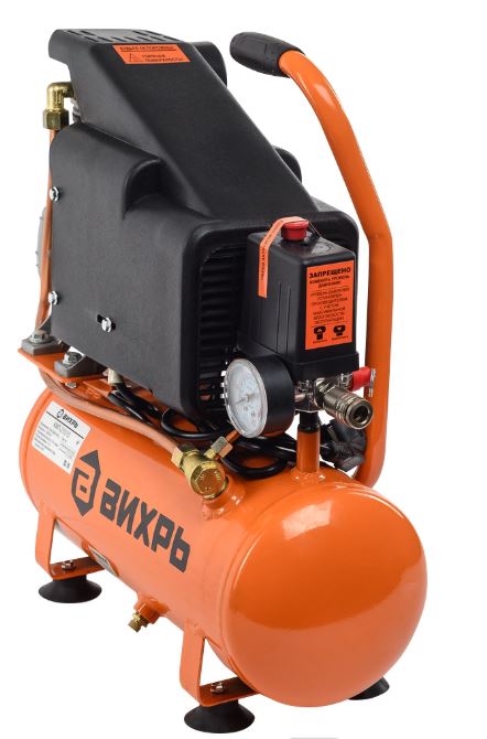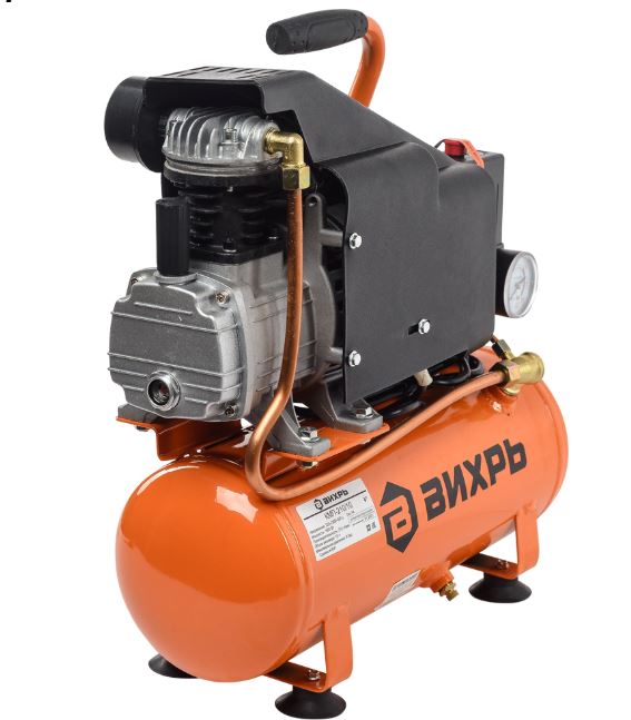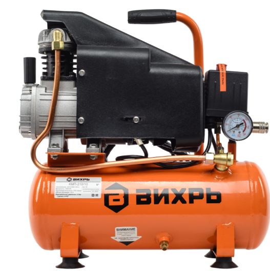 Поршневая конструкция с прямым типом передачи гарантирует надежность и долговечность работы. Оснащение компрессора включает манометр для контроля давления. Предохранительный клапан исключает непредвиденные ситуации, так как стравливает высокое давление при необходимости. За безопасность эксплуатации воздушного компрессора Вихрь КМП-210/10 отвечает блок управления электромеханического типа.