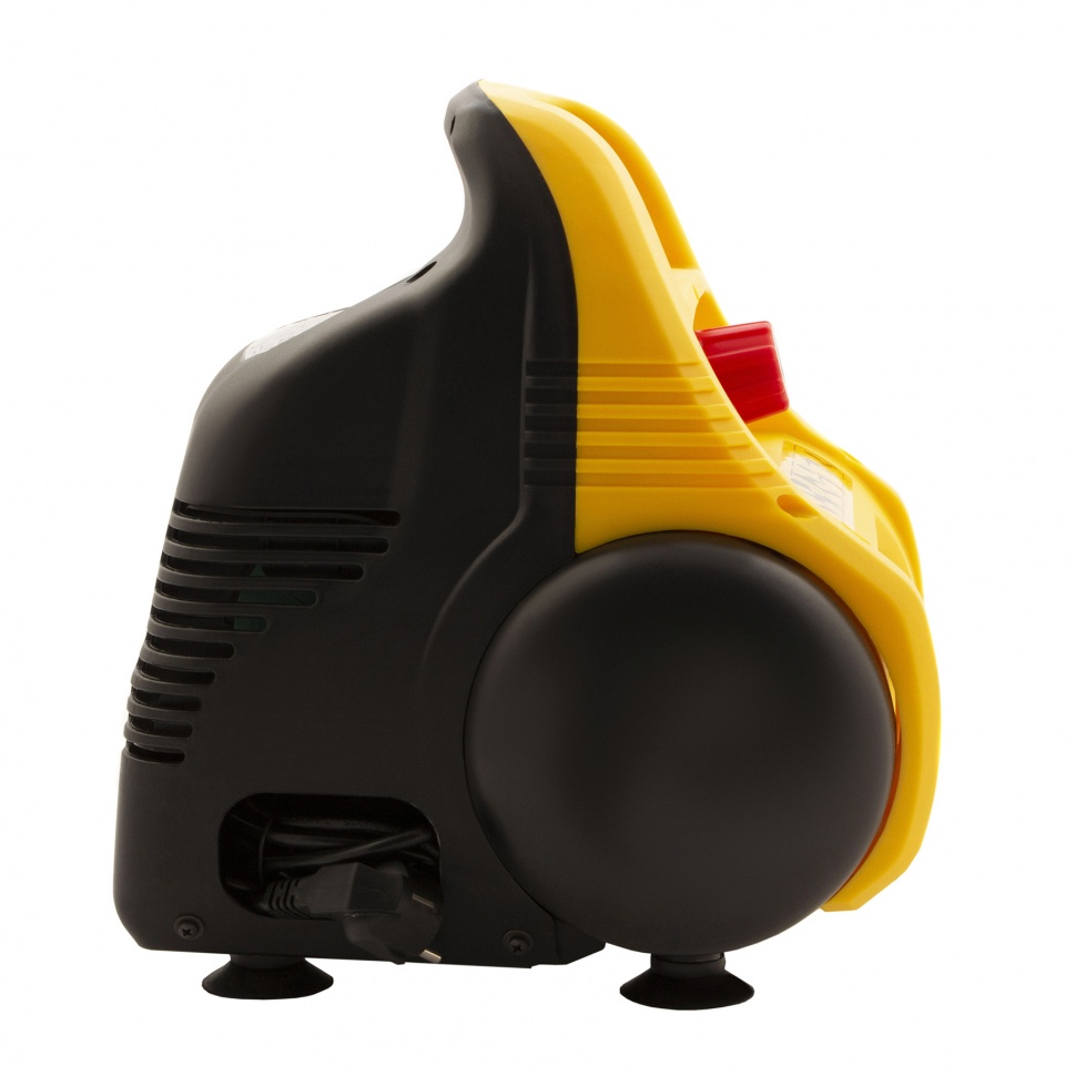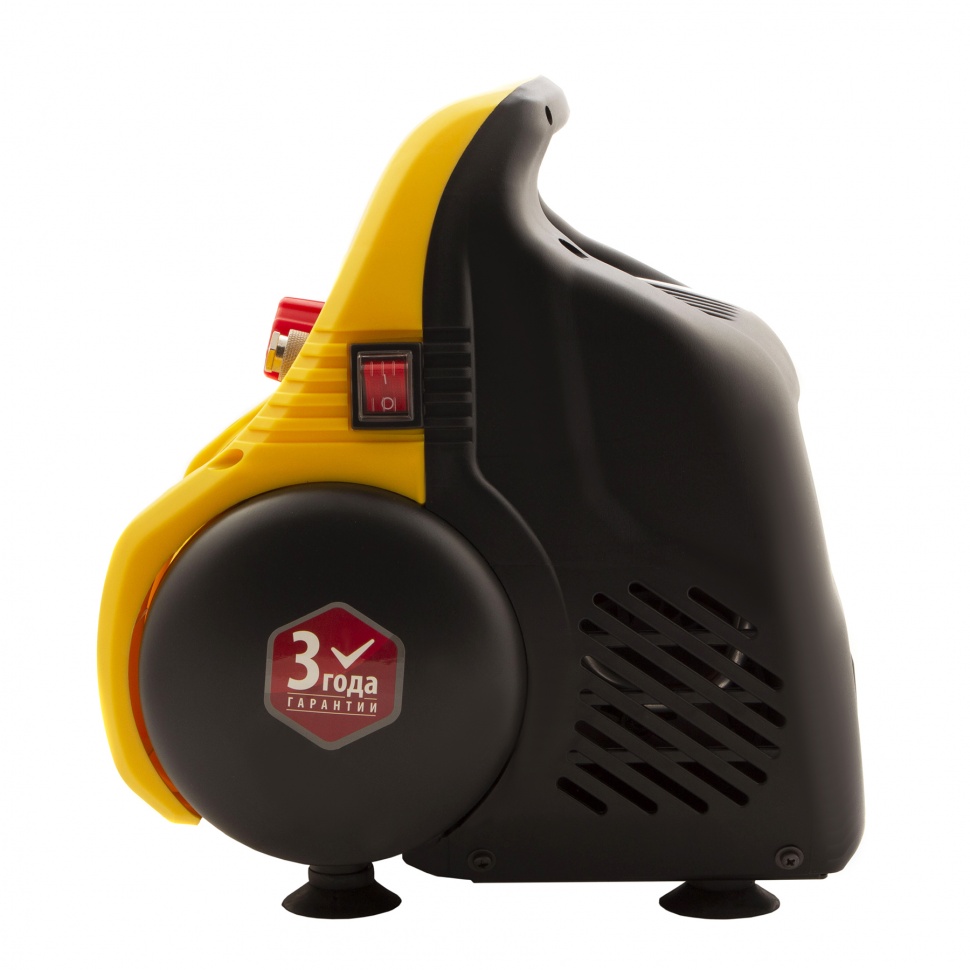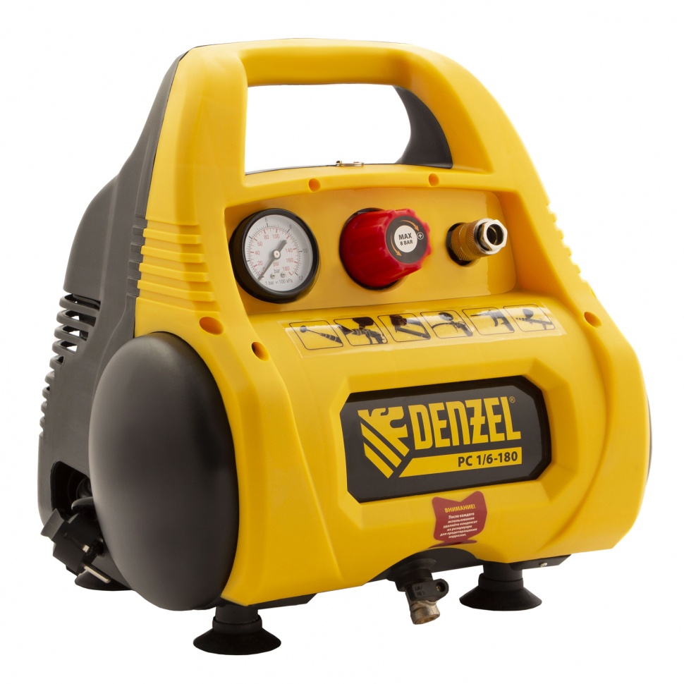 Безмасляный воздушный компрессор Denzel РС 1/6–180 58057 мощностью 1,1 кВт, производительностью 180 л/мин, с ресивером объемом 6 л, подходит для работ, не допускающих попадания масла в воздух. Оптимален для покрасочных работ, накачки шин, продувки компьютерной техники, чистки строительных инструментов.