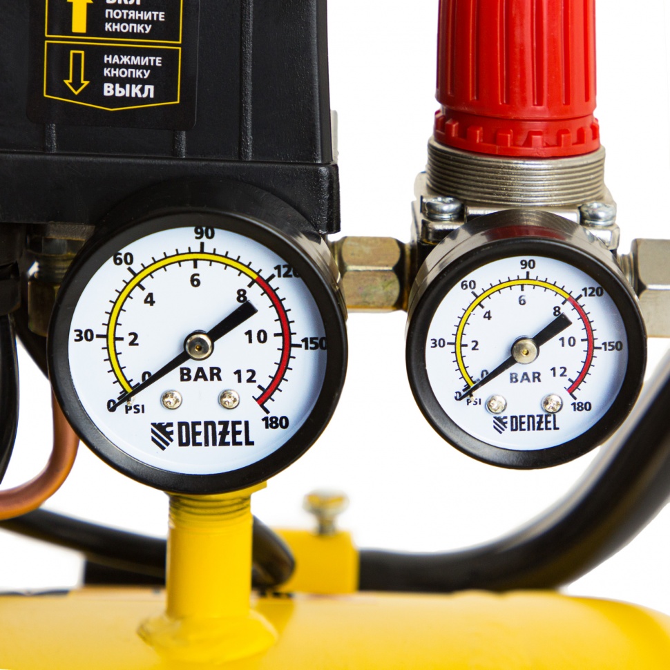 - Контроль рабочих параметров — 2 манометра облегчают отслеживание давления в ресивере и пневмомагистрали.