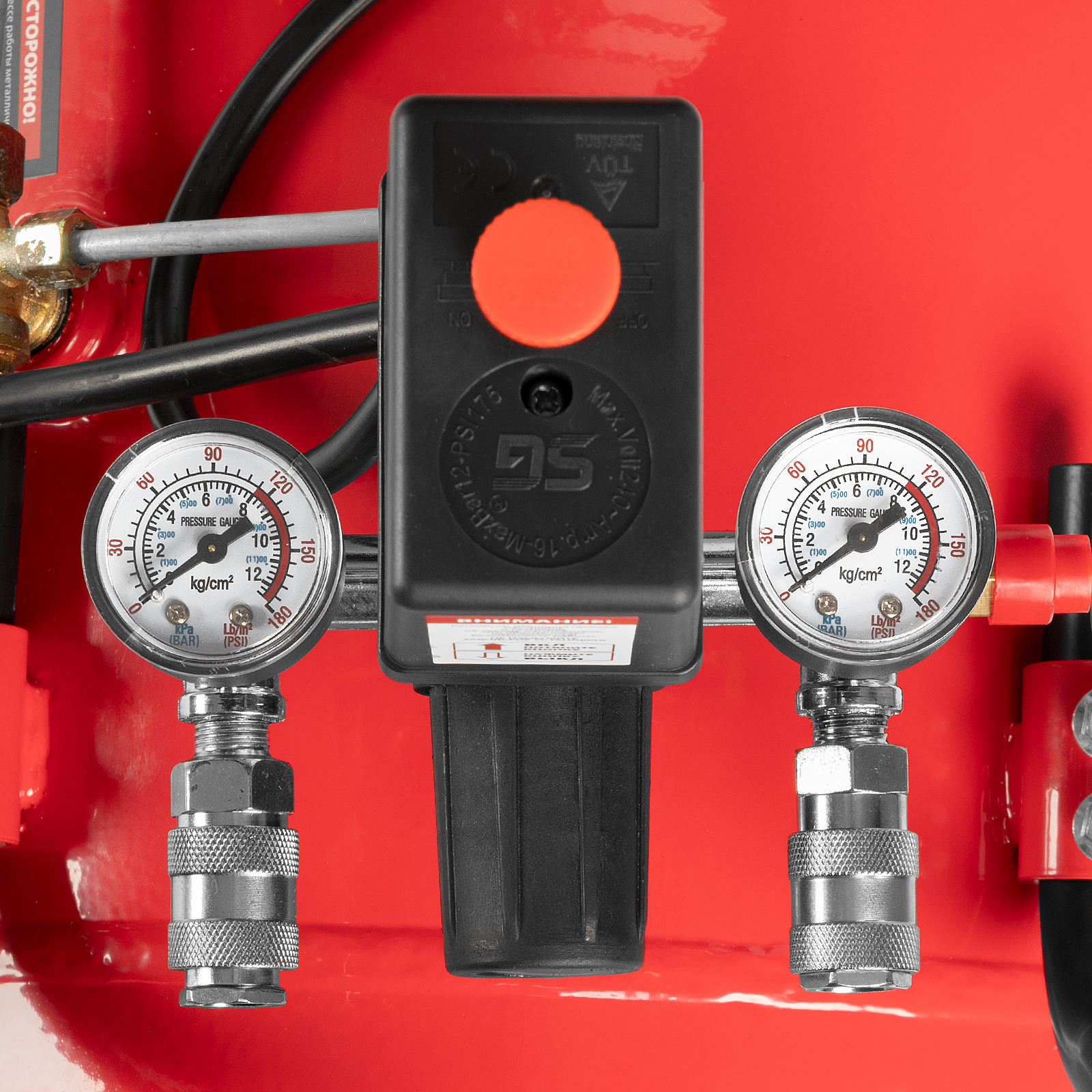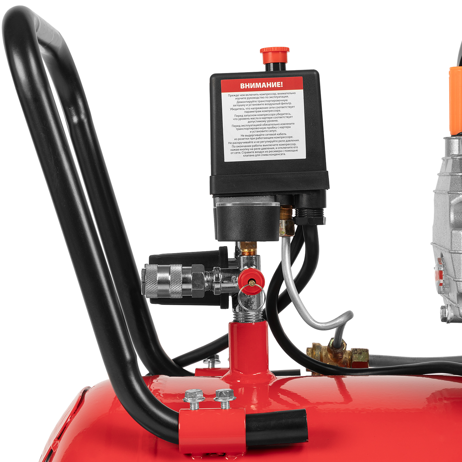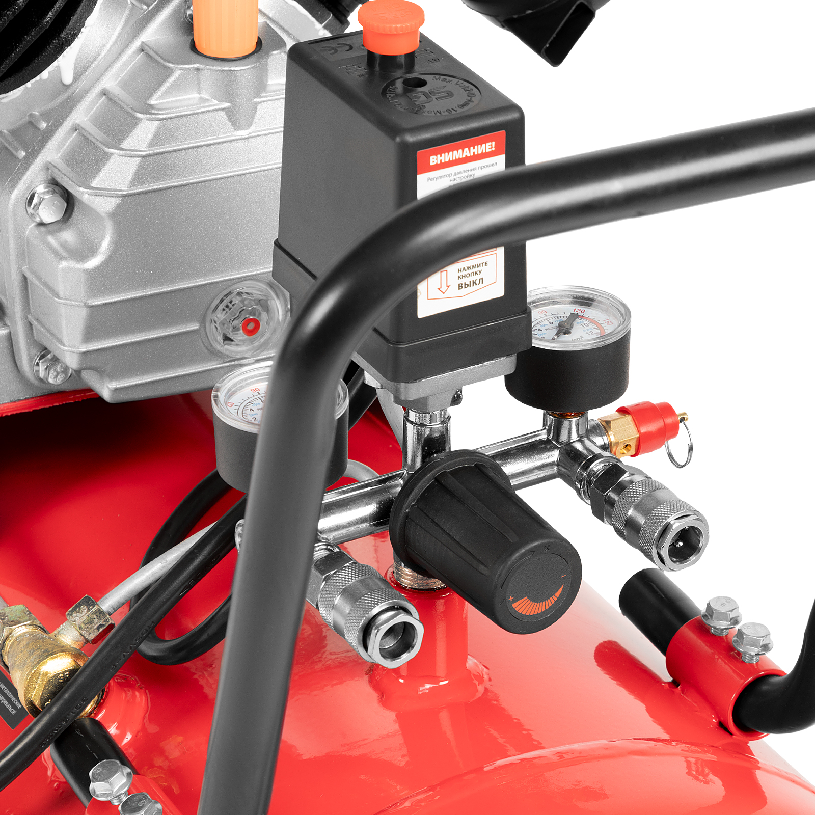 - Автономная работа — прессостат обеспечивает автоматическую остановку двигателя по достижении максимального рабочего давления и запуск при падении давления до минимального уровня.