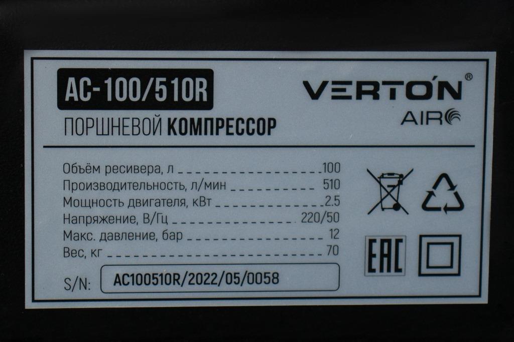 Компрессор Verton Air AC-100/510R с прямым ременным приводом и ресивером увеличенной емкости cлужит для подачи сжатого воздуха, подходит для небольших автомастерских и строительных площадок. Модель оснащается вместительным ресивером на 100 литров, что существенно снижает интенсивность его рабочих циклов. Наличие двух манометров обеспечивает визуальный контроль величины давления и контролировать давление как внутри ресивера, так и на выходе из него. Чугунная головка является устойчивой к механическим повреждениям и увеличенной теплоотдачей. Рукоятка эргономичной формы и транспортировочные колеса облегчают маневренность и удобство транспортировки.