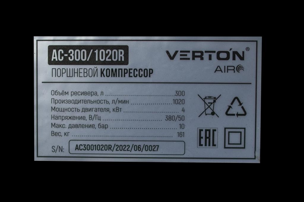 Компрессор Verton Air AC-300/1020R (380/50 В/Гц,масл.рем.1020л/м,300л,10б,4 кВт,2800об/мин,рапид)