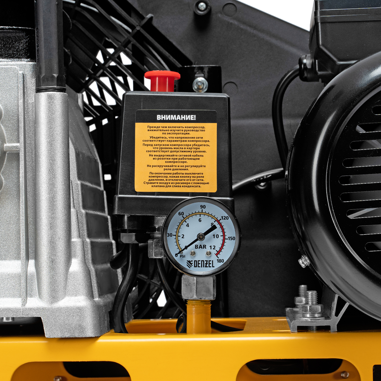 - Автономная работа — прессостат останавливает компрессор по достижении максимального рабочего давления 8 бар и запускает его, если давление падает ниже допустимого уровня.