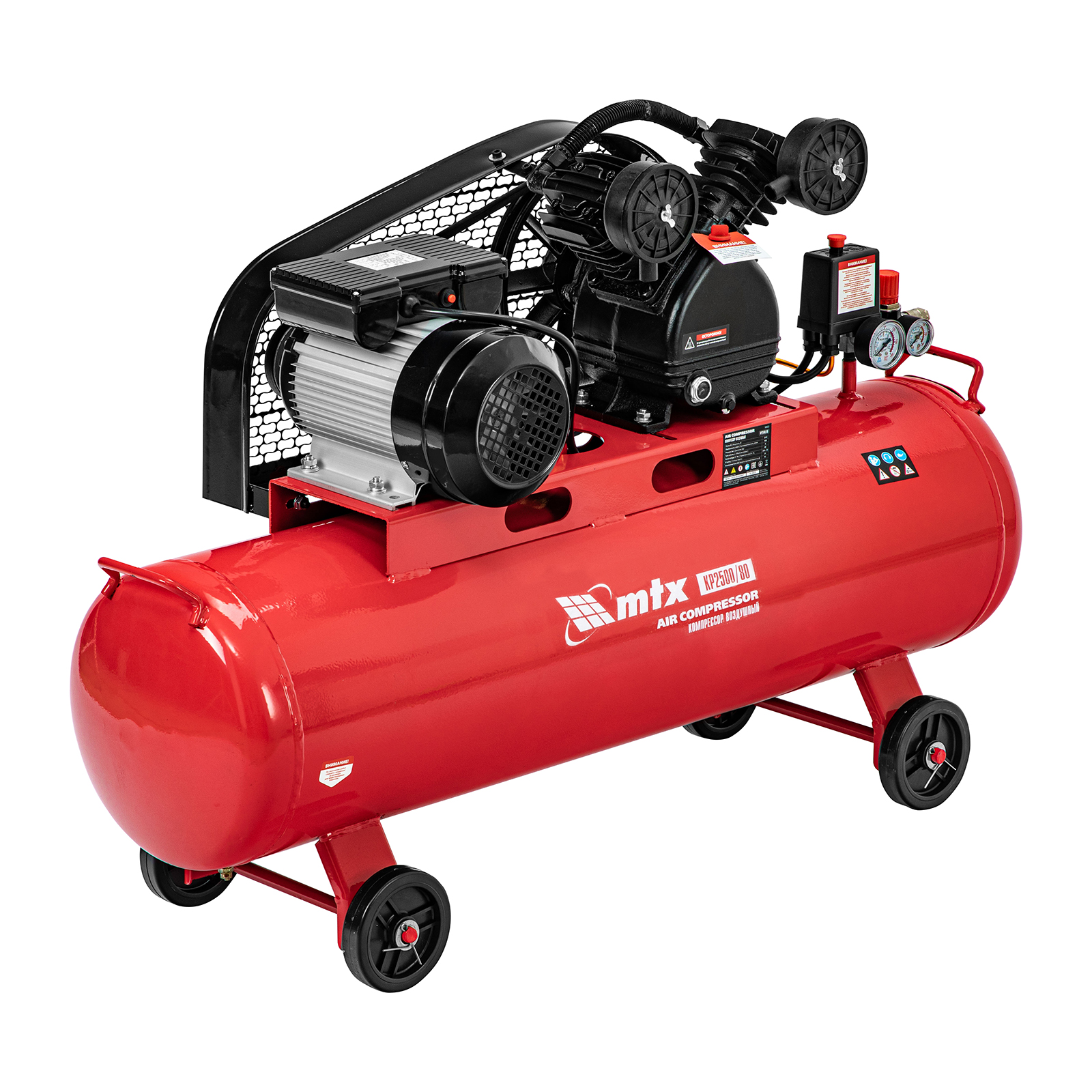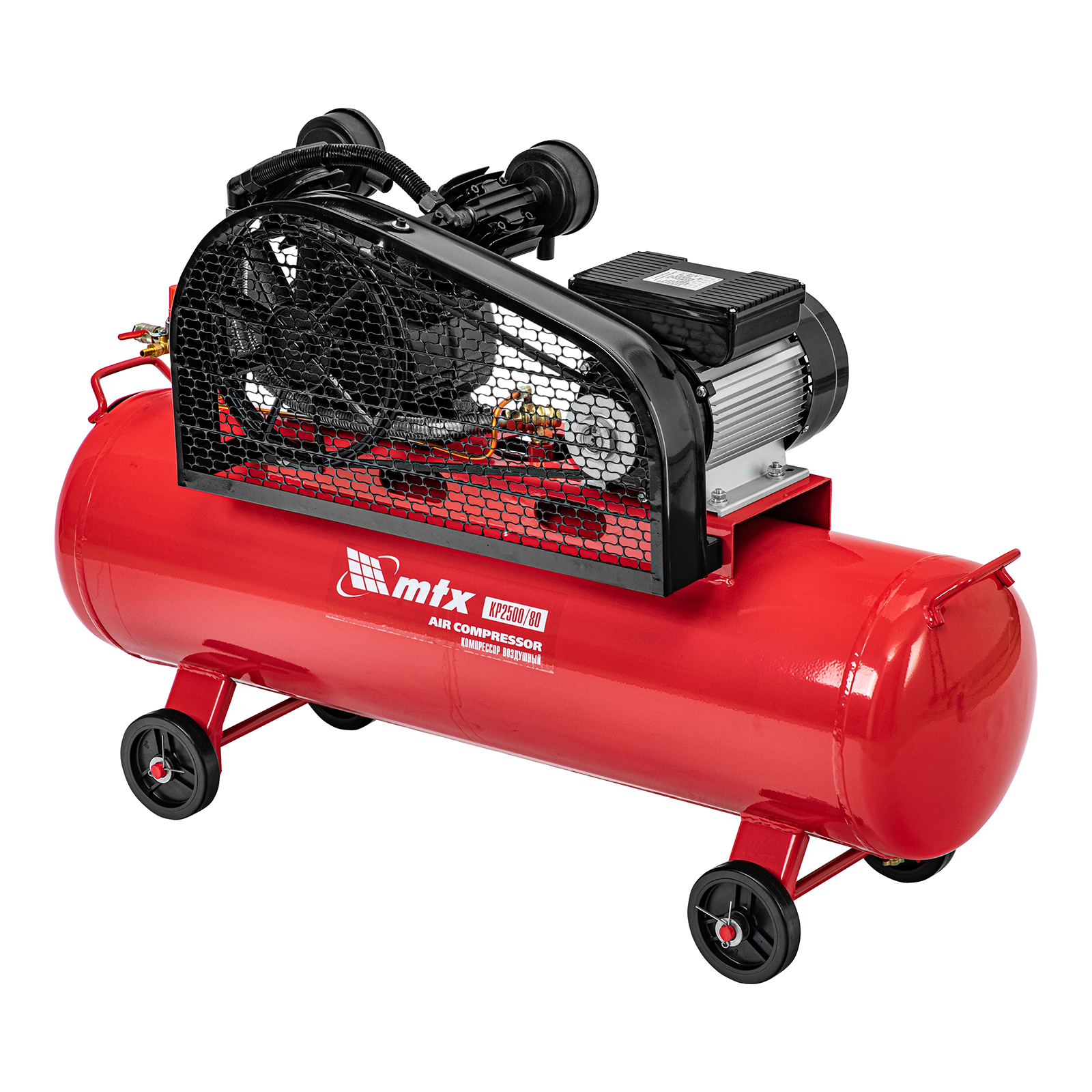 Компрессор воздушный МТХ КР2500/80 58022 с ременным приводом от электродвигателя, мощностью 2,5 кВт и производительностью 420 л/мин, с ресивером объемом 80 литров, применяется для подачи сжатого атмосферного воздуха к пневматическому инструменту. К нему можно подключить гайковерт, дрель, углошлифовальную машину, степлер, краскопульт, продувочный пистолет или другой пневмоинструмент. Для подключения предусмотрены 2 штуцера: быстросъемный и «елочка». Компрессор подходит для профессионального использования на предприятии автосервиса, строительной площадке, в мастерской.