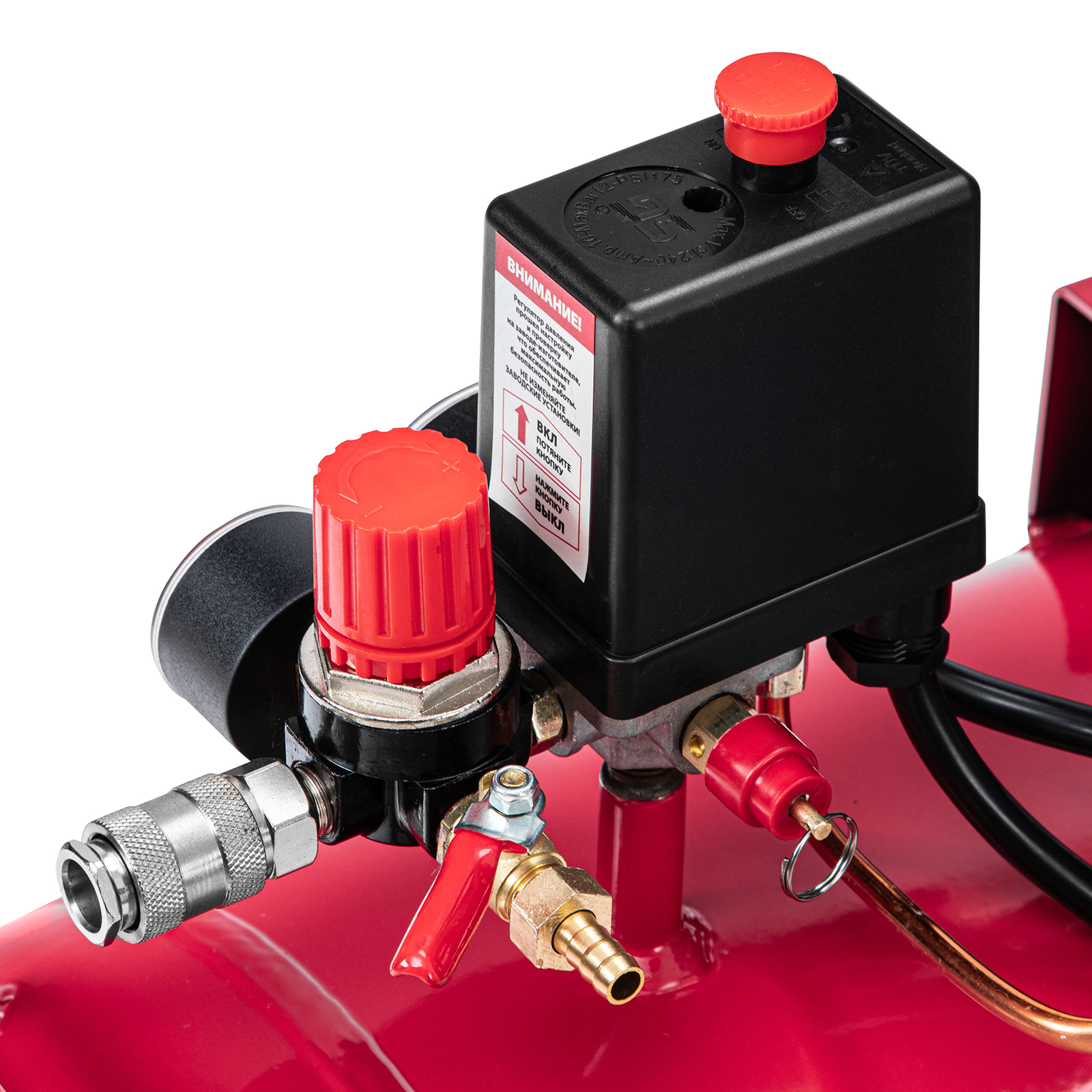 - Автоматическая регулировка производительности — прессостат останавливает двигатель при достижении максимального рабочего давления (8 бар) и запускает его при падении давления ниже минимально допустимого уровня.