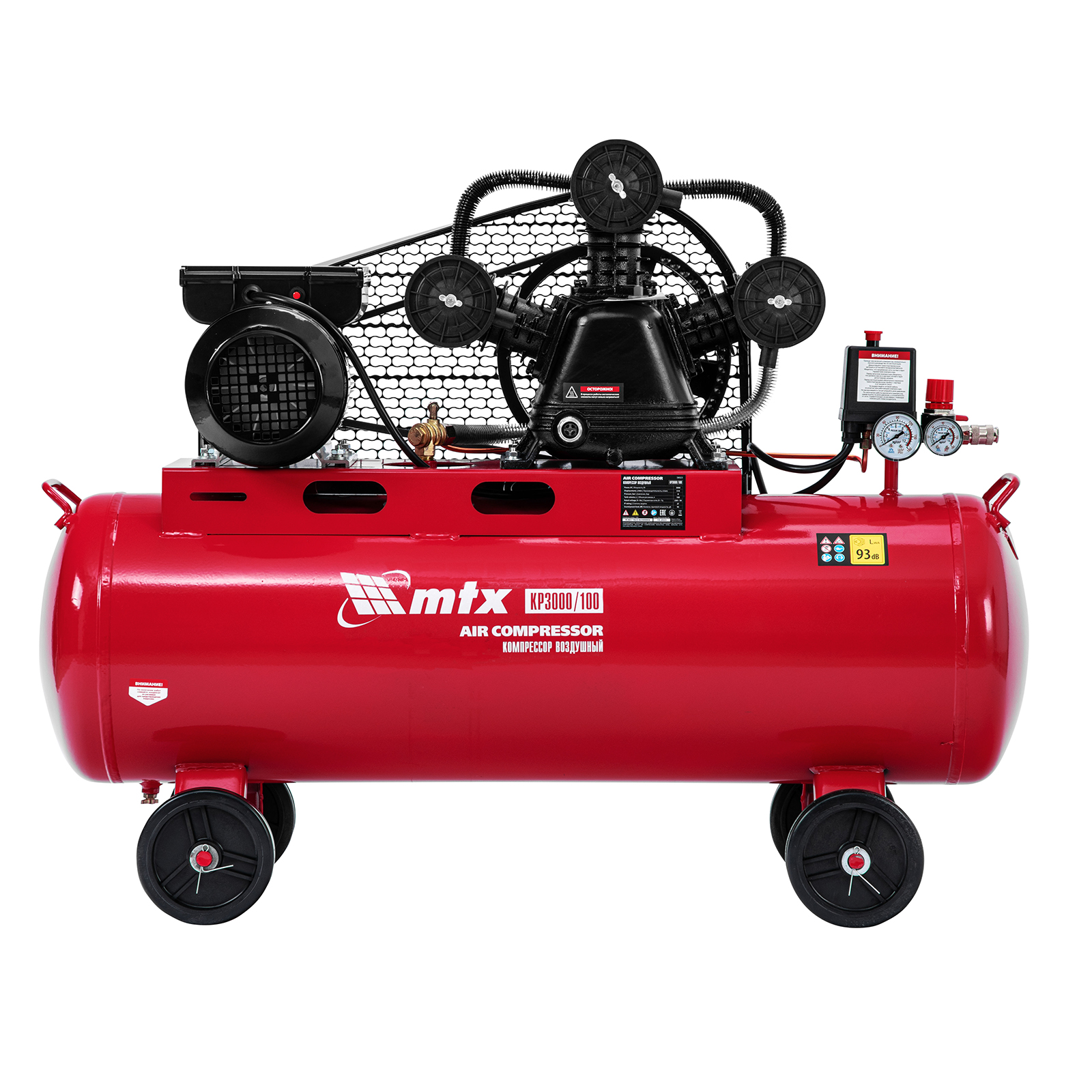 Компрессор воздушный МТХ КР3000/100 58023 с ременным приводом от электродвигателя, мощностью 3,0 кВт и производительностью 510 л/мин, с ресивером объемом 100 литров, применяется для подачи сжатого атмосферного воздуха к пневматическому инструменту. К нему можно подключить гайковерт, дрель, углошлифовальную машину, степлер, краскопульт, продувочный пистолет или другой пневмоинструмент. Для подключения предусмотрены 2 штуцера: быстросъемный и «елочка». Компрессор подходит для профессионального использования на предприятии автосервиса, строительной площадке, в мастерской.