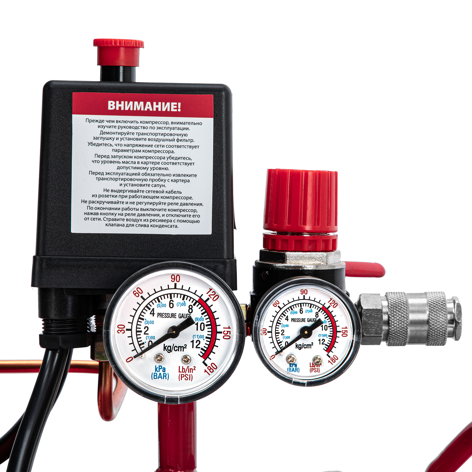 - Удобный контроль давления в ресивере и пневмомагистрали — компрессор оснащен двумя механическими манометрами.