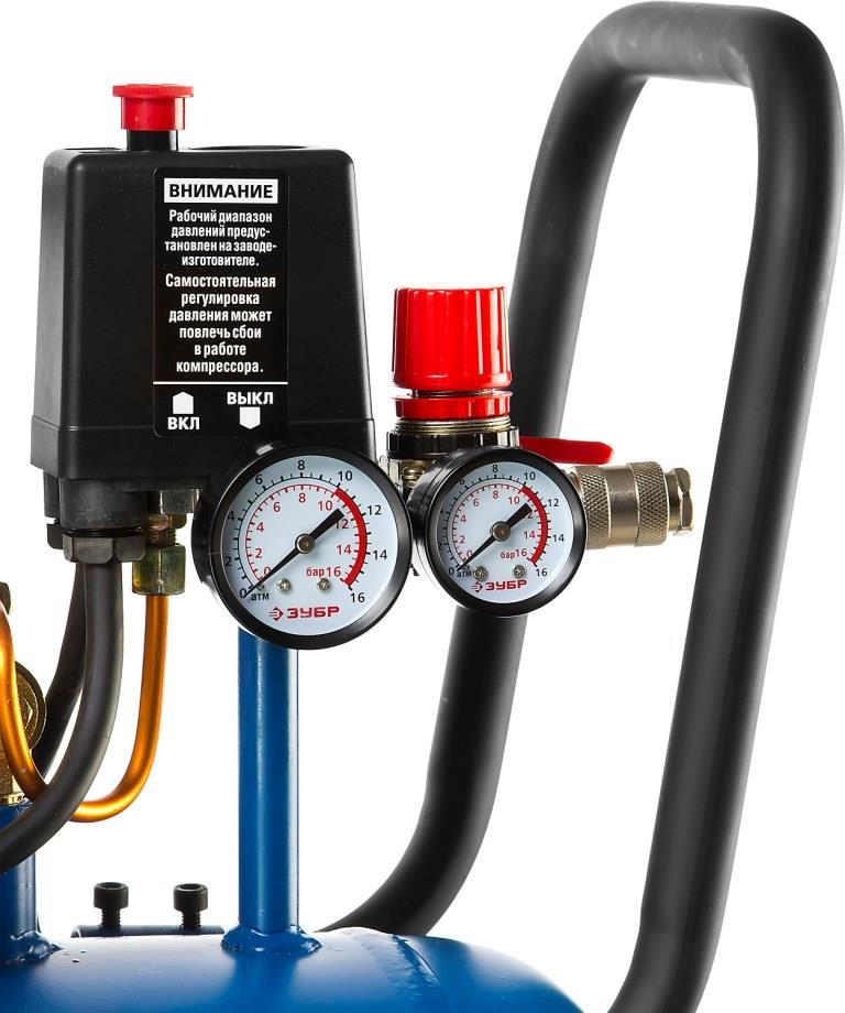 - Контроль давления в ресивере и на выходе при помощи двух манометров