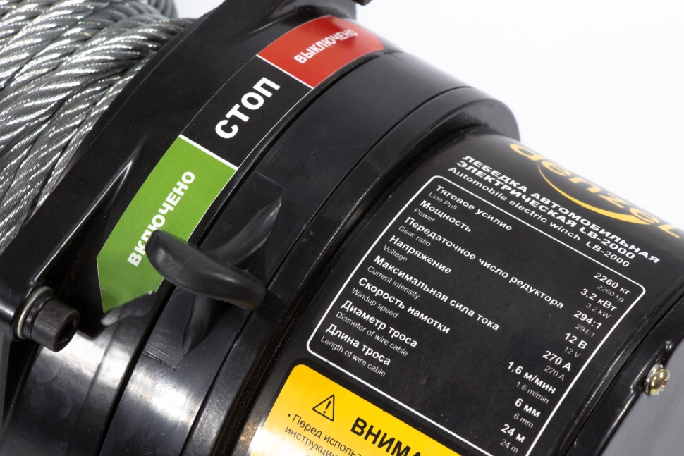 Лебедка Denzel LB-2000 52021 мощностью 3,2 кВт и скоростью намотки троса 1,6 м/мин используется для перемещения грузов в горизонтальной плоскости, а также эвакуации и вытягивания из водоемов и кюветов транспортных средств весом до 2,2 т, например, квадроциклов, легких внедорожников, сельхозтехники. Лебедка устанавливается непосредственно на бампере, раме или кузове, проста в применении и не требует специальной подготовки.