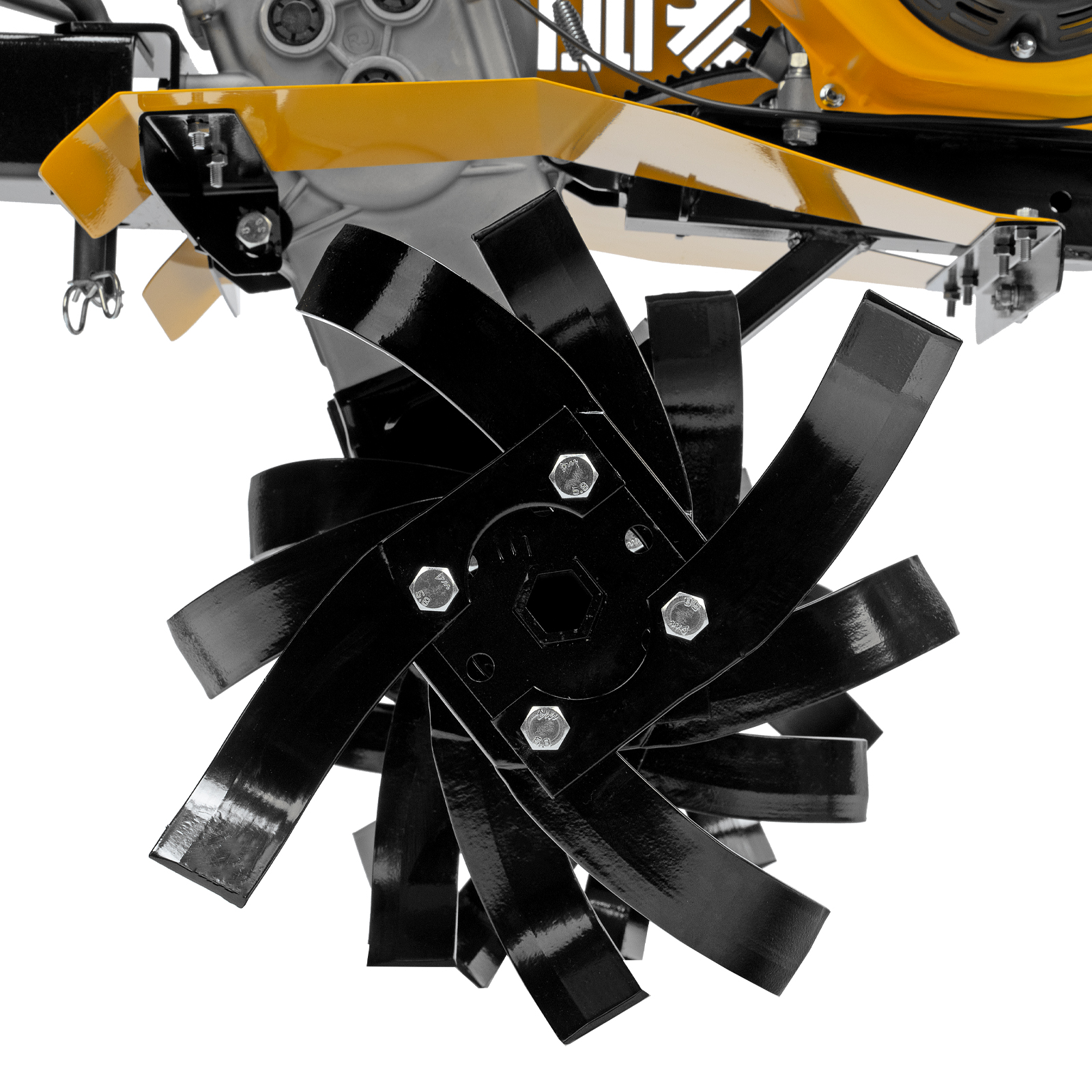 - Настраиваемая глубина вспахивания — отрегулировав сошник по высоте, можно задать степень погружения фрез до 350 мм.