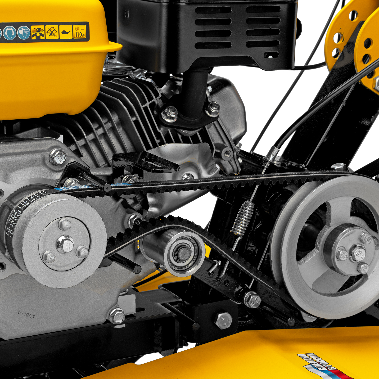 Чугунный шестеренчато-цепной редуктор позволяет работать длительное время с большими нагрузками, шкив отбора мощности и кронштейн диаметром 30 мм позволяют подключать активное навесное оборудование.