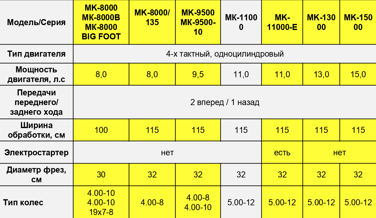 - Возможность выбрать скорость (для тяжелых и средних культиваторов) и две скорости работы "вперед и назад" для всей линейки культиваторов.