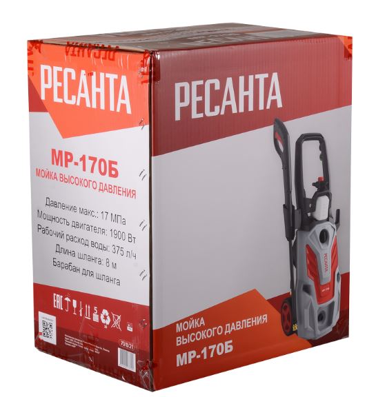 МР-170Б Ресанта обладает высокой мощностью двигателя 1900 Вт. Рабочее давление отмечено показателем 11МПа (110 бар), максимальное 17 МПа (170 бар). Подача жидкости возможна как через водопровод, так и через ёмкость. Расход воды составляет 375 литров в час.