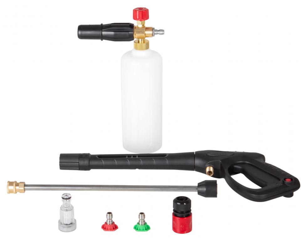 | Комплектация | Паспорт изделия, Фильтр, Пистолет-распылитель разборный, Шланг высокого давления, Пеногенератор, Игла для очистки сопла, Сменные форсунки, Быстросъёмный коннектор для шланга подачи воды |