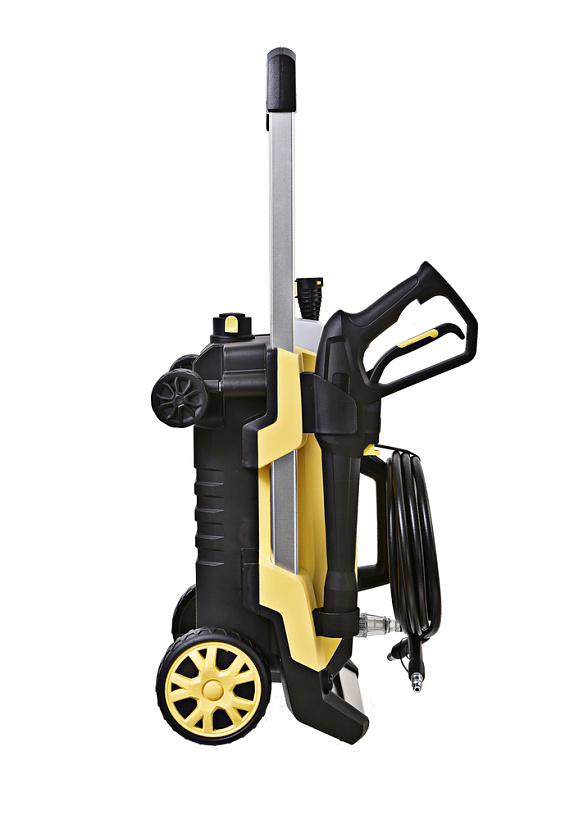 В конструкции мойки предусмотрено 4 колеса: 2 основных для перемещения в вертикальном положении за ручку и 2 дополнительных поворотных для перемещения в горизонтальном положении за шланг в след за пользователем.