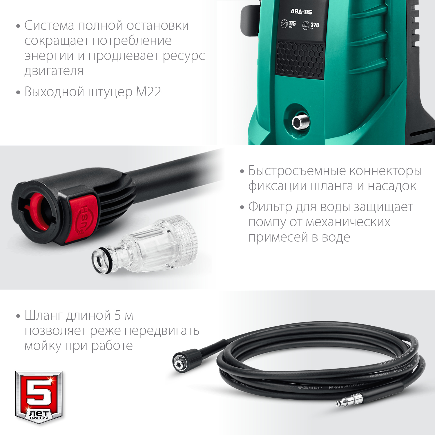 - Быстросъемное соединение шланга, распылителя и насадок позволяет оперативно собирать и переподключать компоненты