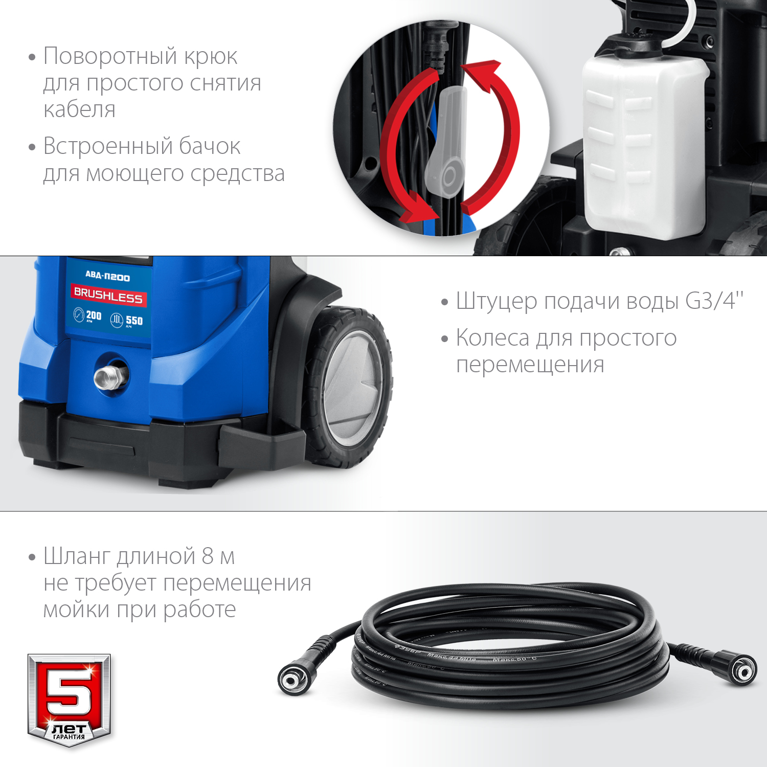 - Шланг длиной 8 м позволяет производить обработку без необходимости перемещать мойку