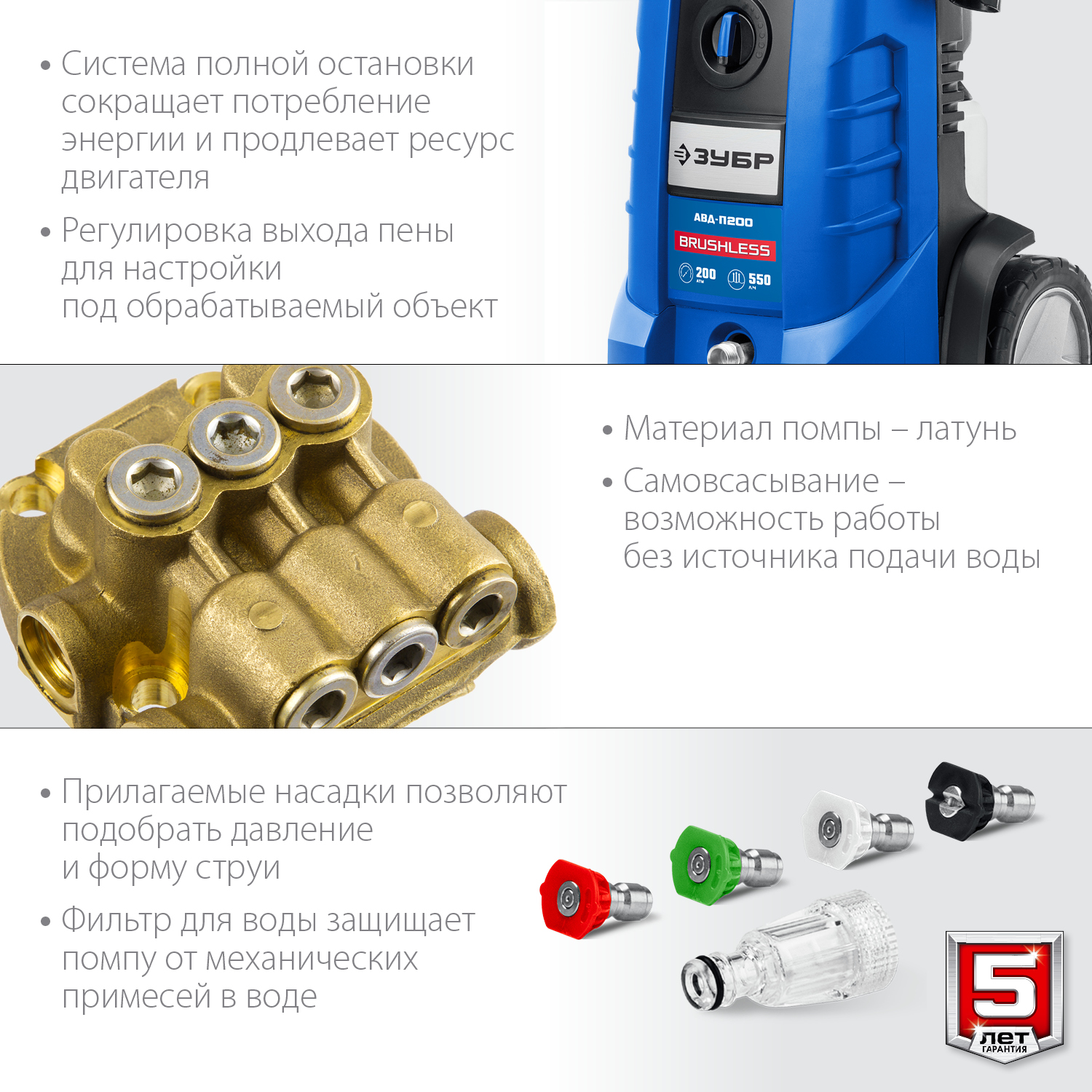 - Система полной остановки выключает двигатель при отпускании клавиши пистолета, что экономит энергию и увеличивает ресурс помпы