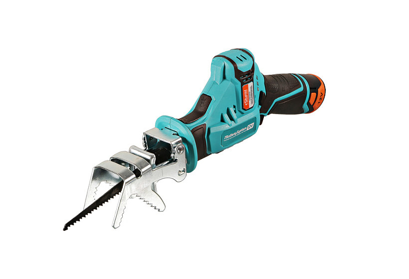 Аккумуляторная сабельная пила Sturm! применяется для продольного, поперечного, под углом и фигурного пиления заготовок из дерева, фанеры, ДСП, пластмасс, металла и пенобетона (при установке соответствующего полотна).