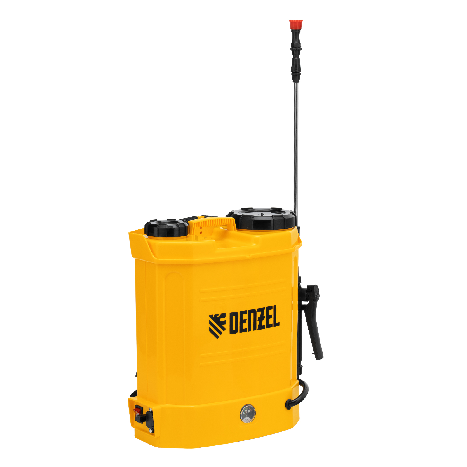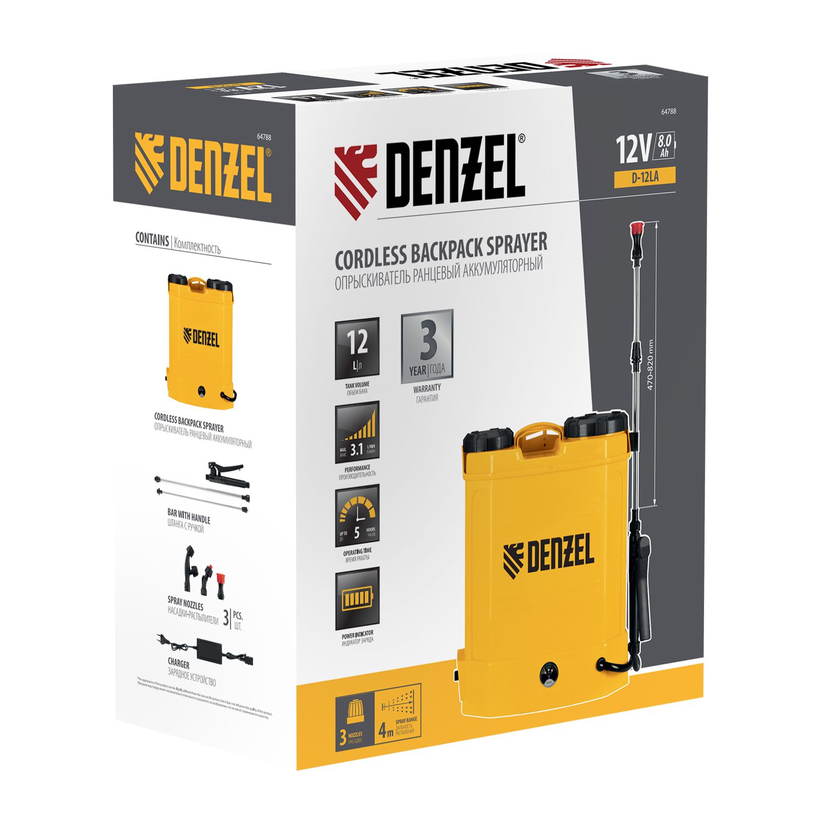 Ранцевый аккумуляторный опрыскиватель Denzel D-12LA 64788 с баком объемом 12 л и батареей на 12 В, емкостью 8 Ач, предназначен для распыления воды или инсектицидов. Используется для ухода за растениями, дезинфекции помещения, мытья окон и фасадов. Длина штанги регулируется в диапазоне 470-820 мм, а максимальная дальность распыления составляет 4 м, что облегчает обработку труднодоступных мест.