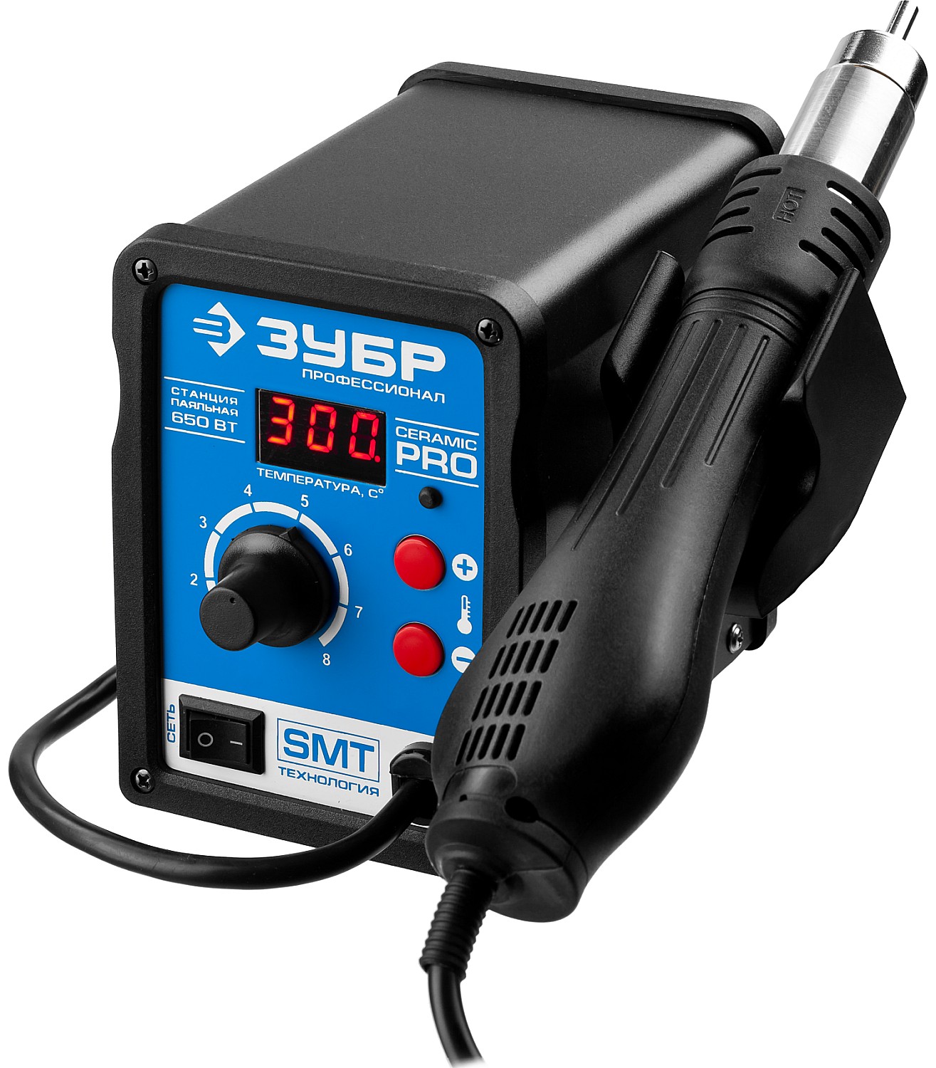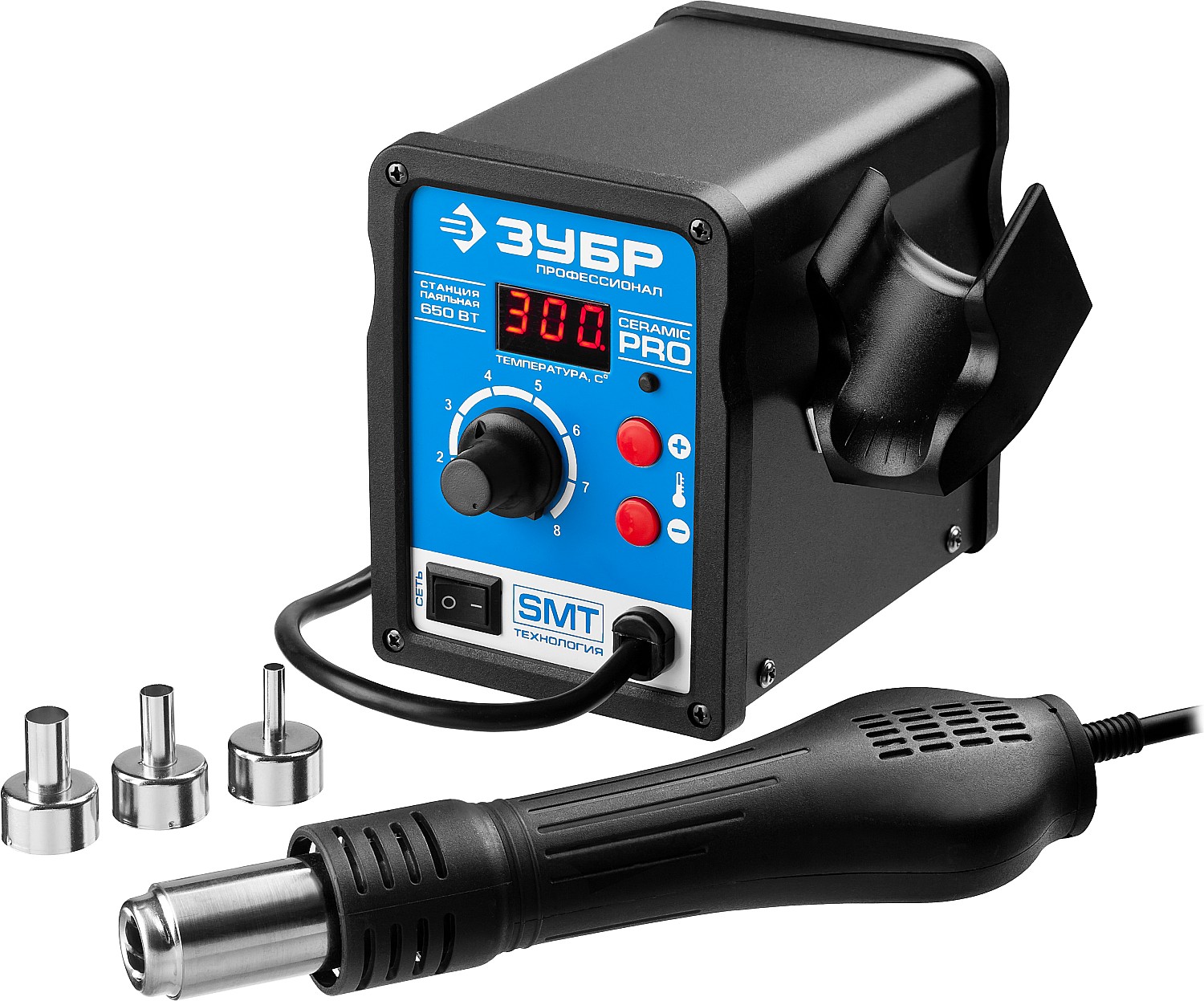 Термовоздушная паяльная станция ЗУБР цифровая 650Вт, 100-500°C, 120 л/мин, 3 насадки, керамический н