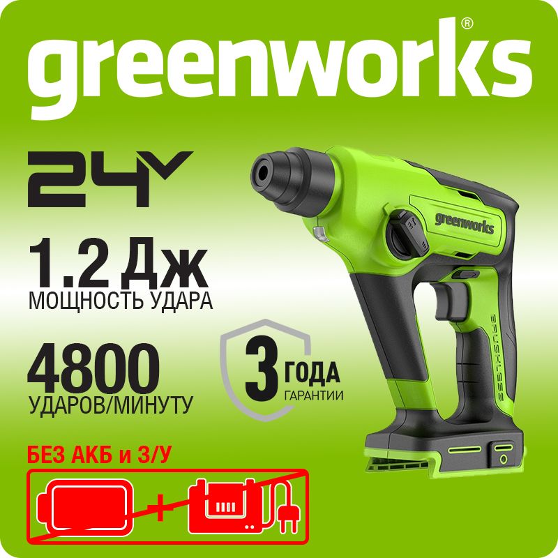 Перфоратор акк. Greenworks GD24SDS1, 24V, б/щет, SDS+, 1,2 Дж, 4800 уд/мин, 12 мм, без АКБ и ЗУ (3803107)