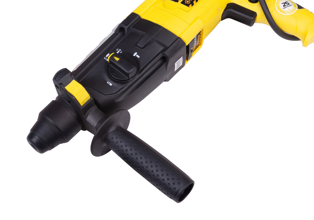 Плавная регулировка оборотов позволяет аккуратно начинать засверливание и использовать перфоратор в качестве миксера с применением специальных насадок.