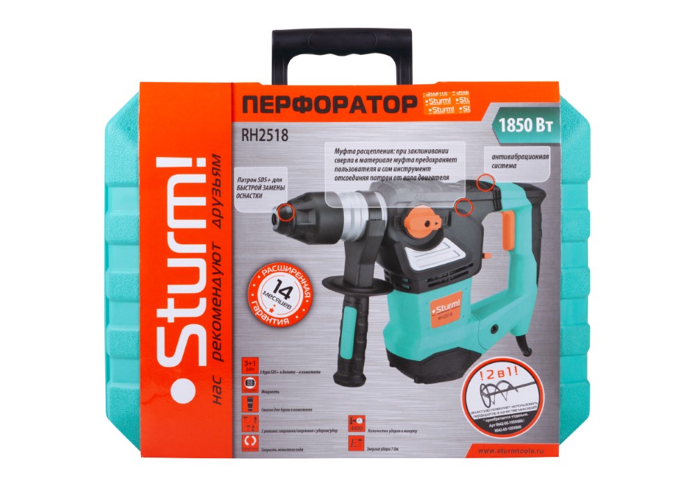 Перфоратор SDS Plus Sturm! RH2518 Мощная модель с усиленным ударным механизмом для более производительной работы. Быстрое ударное сверление в бетоне и кирпичной кладке, долбление, сверление. Вертикальное расположение двигателя позволяет перфоратору выдерживать серьезные нагрузки. Патрон SDS-plus позволяет производить быструю смену оснастки одним движением ускоряя рабочий процесс. Антивибрационная рукоятка снимает значительную часть нагрузки с оператора.
