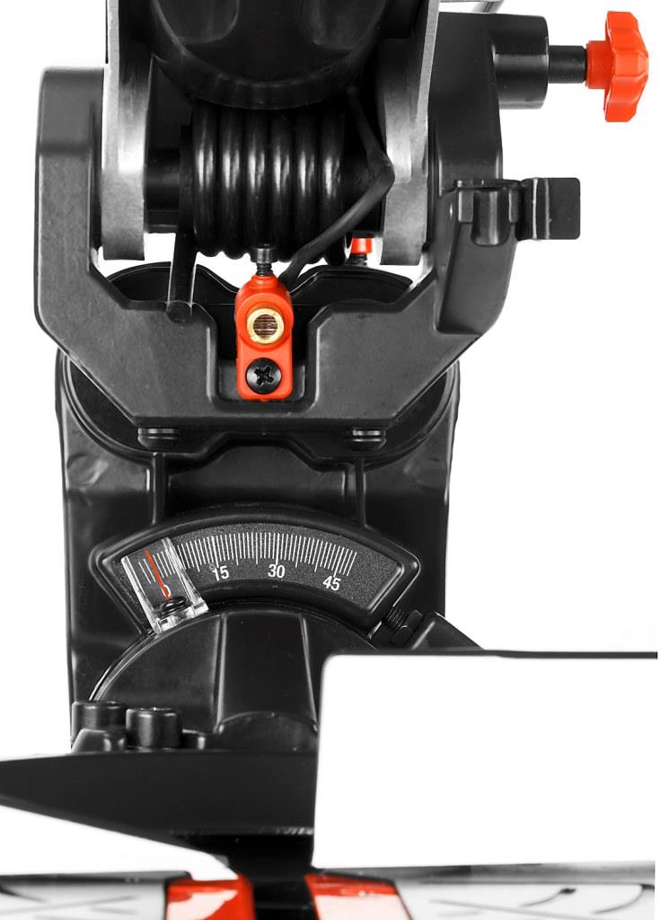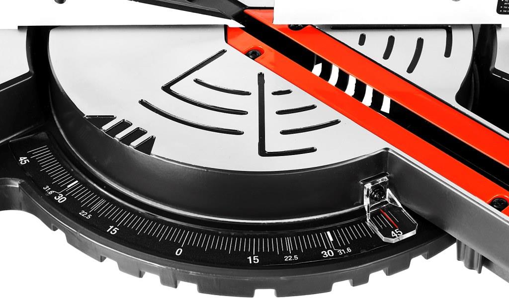 - Фиксирующийся в любом положении поворотный стол и удобная регулировка наклона облегчают установку угла пиления