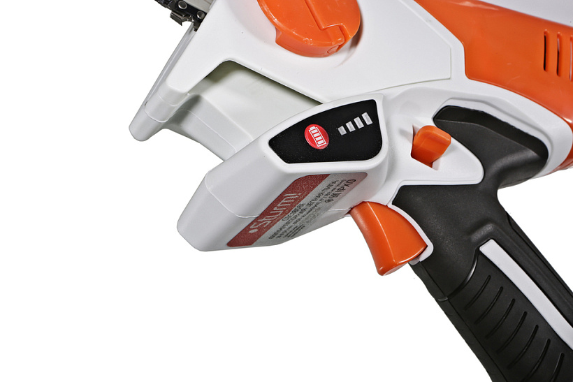 Эргономичная рукоять с противоскользящей прорезиненной поверхностью гарантирует надежный хват для комфортной работы с пилой. Индикатор заряда аккумулятора — для лучшего контроля работы с инструментом.