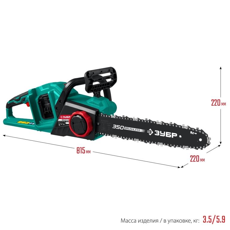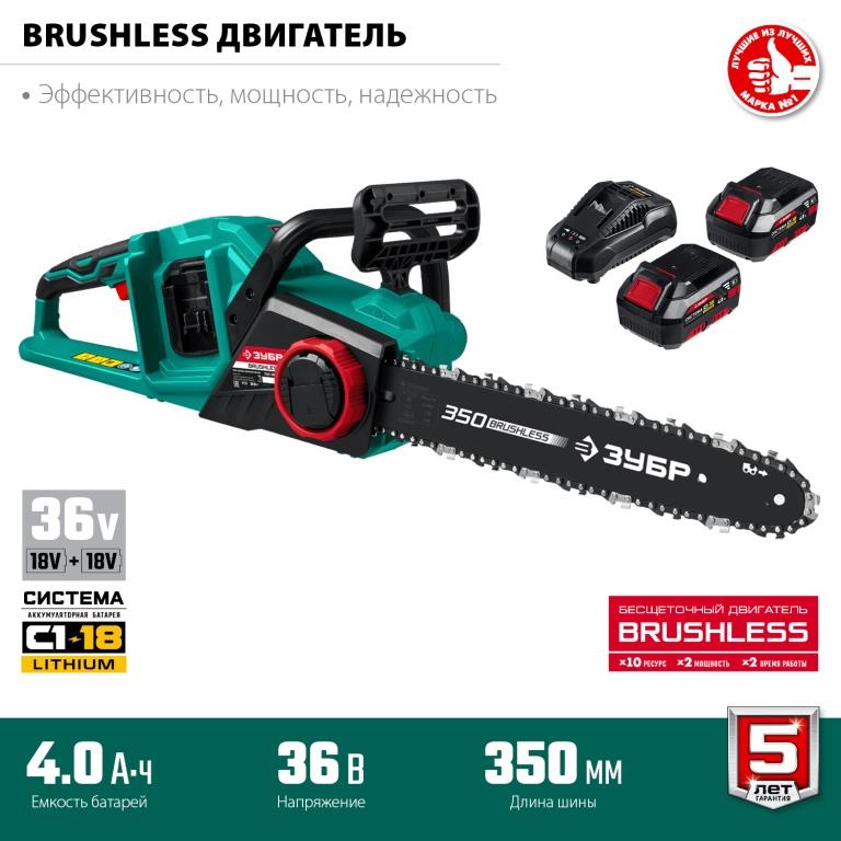 - Мощный двигатель напряжением 36 В ускоряет процесс пиления, а шина длиной 350 мм позволяет справляться с большинством веток