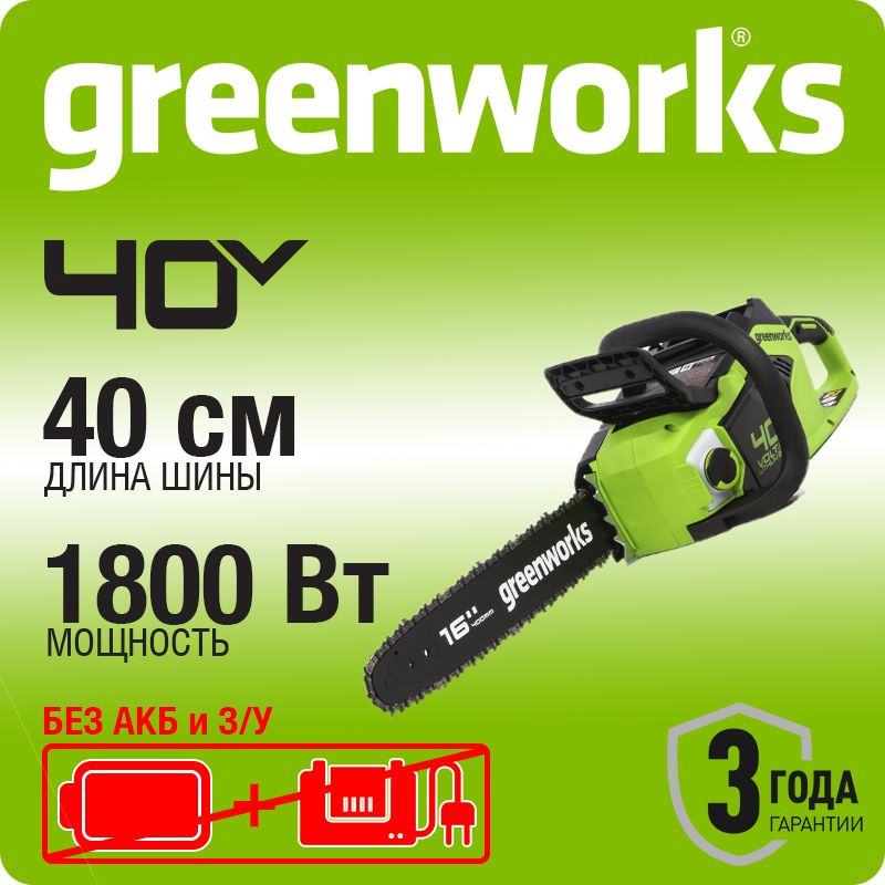Цепная пила аккумуляторная Greenworks Арт. 2005807, 40V, 40 см, бесщеточная, 1,8 кВт, без АКБ и ЗУ- полупрофессиональная цепная пила, которая отлично подойдет для полноценного ведения дачного хозяйства.