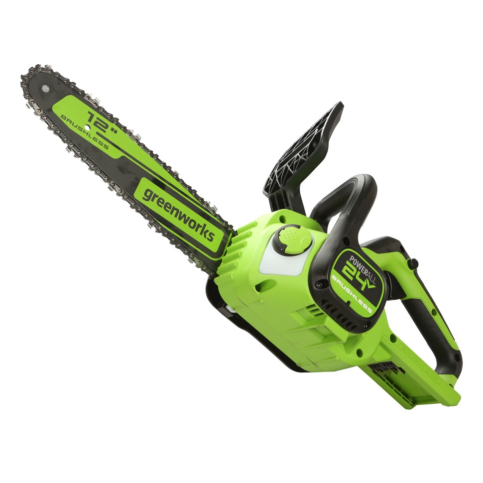 - Greenworks GD24CS30 превосходно справляется с резкой древесины в любом нужном месте за счёт мощного бесщёточного двигателя и производительного понижающего редуктора.