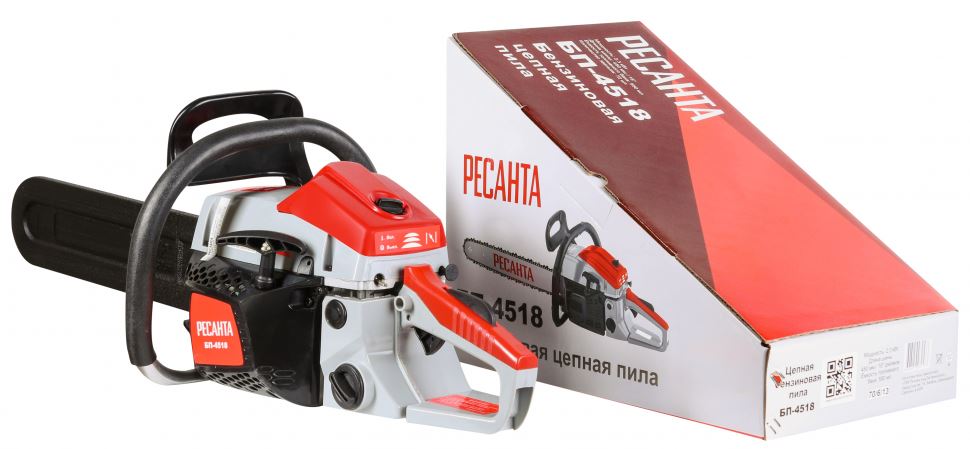Бензопила БП-4518 Ресанта – легкий и надежный инструмент для дачи и небольшого загородного строительства. Пила укомплектована двигателем на 2,3 л.с.и 45 сантиметровой шиной для заготовки дров и подрезки небольших деревьев. Автоматический тормоз цепи и щиток для рук обеспечивают безопасность. Воздушный фильтр защищен специальным кожухом, который легко открывается с помощью специального поворотного колесика. Рукоятка бензопилы БП-4518 Ресанта имеет удобную для захвата форму. Расширенная нижняя часть рукоятки - для защиты руки при разрыве цепи. Объем бака в 0,55 литра хватает на долгую работу без дозаправки. В полной комплектации пила весит 7 кг.