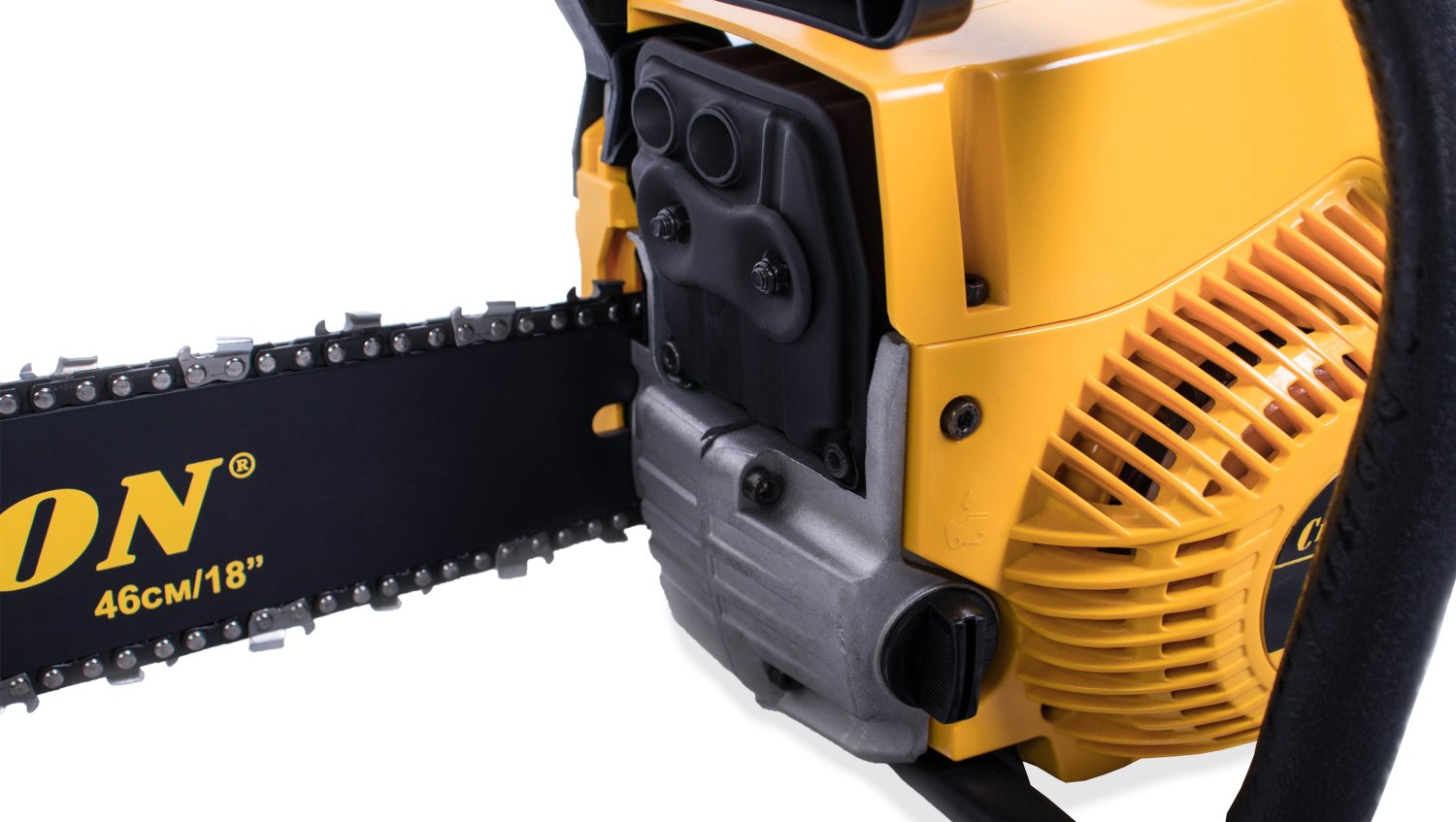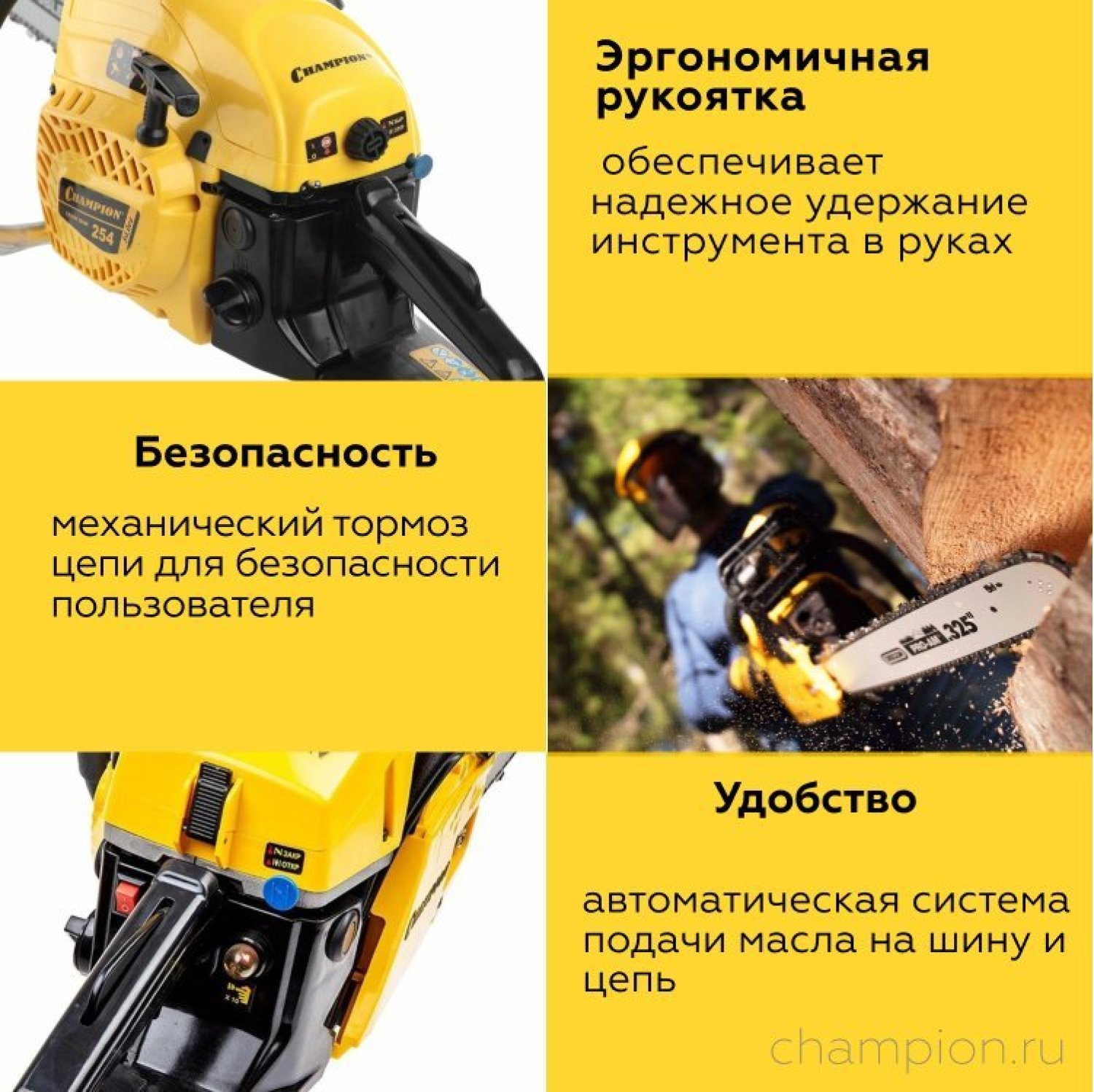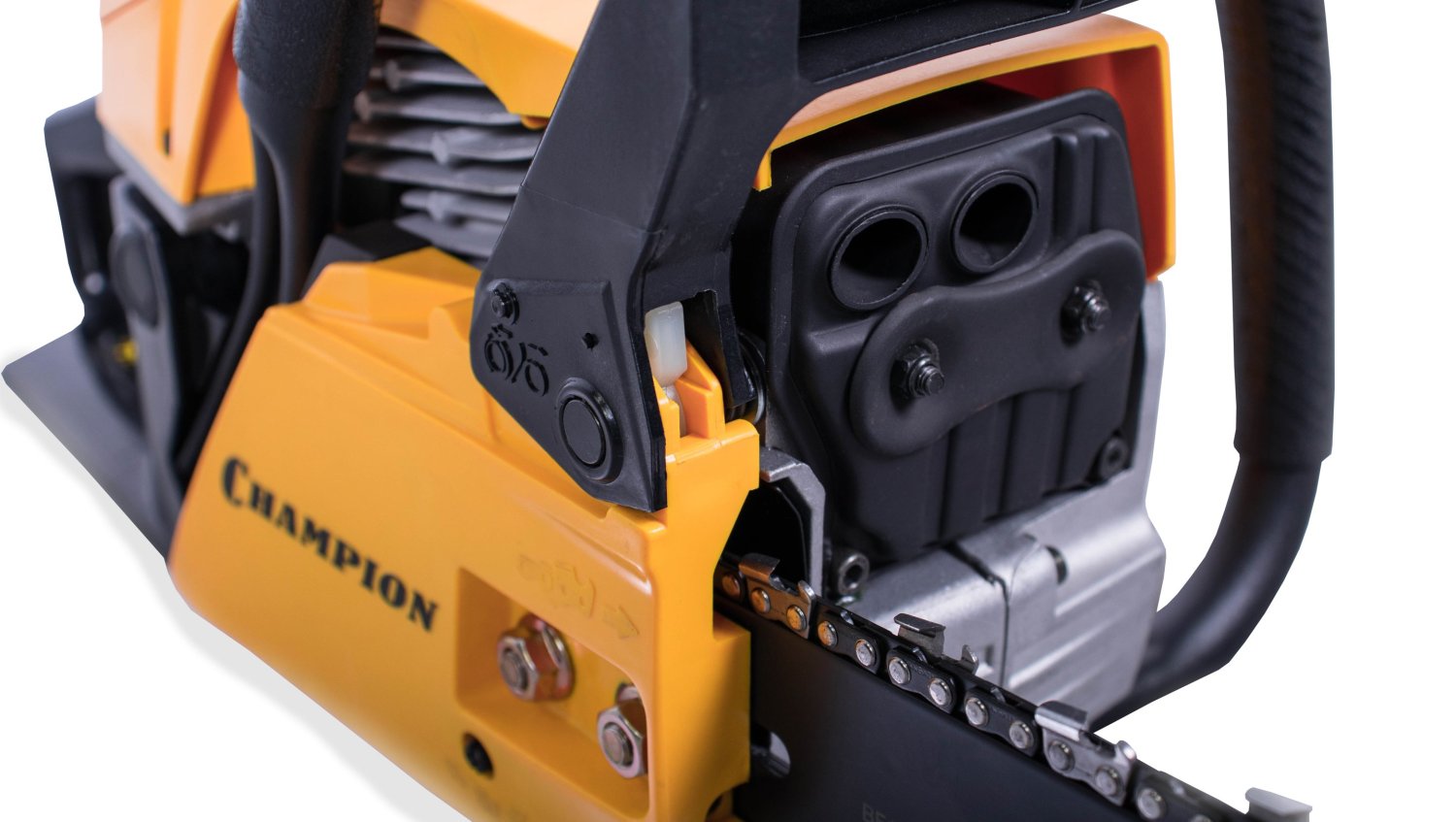 Длина пильного полотна составляет 45 см, что позволяет валить деревья большого диаметра. Пильное полотно имеет ширину паза 1,5 мм, а его ведомая звездочка крепиться на четырех клепках. Бензопила Champion 256-18 оборудована надежным диафрагменным карбюратором, обеспечивающим уверенный запуск даже при отрицательных температурах. Для работы зимой у пилы предусмотрен подогрев карбюратора за счет направления на него горячих выхлопных газов.