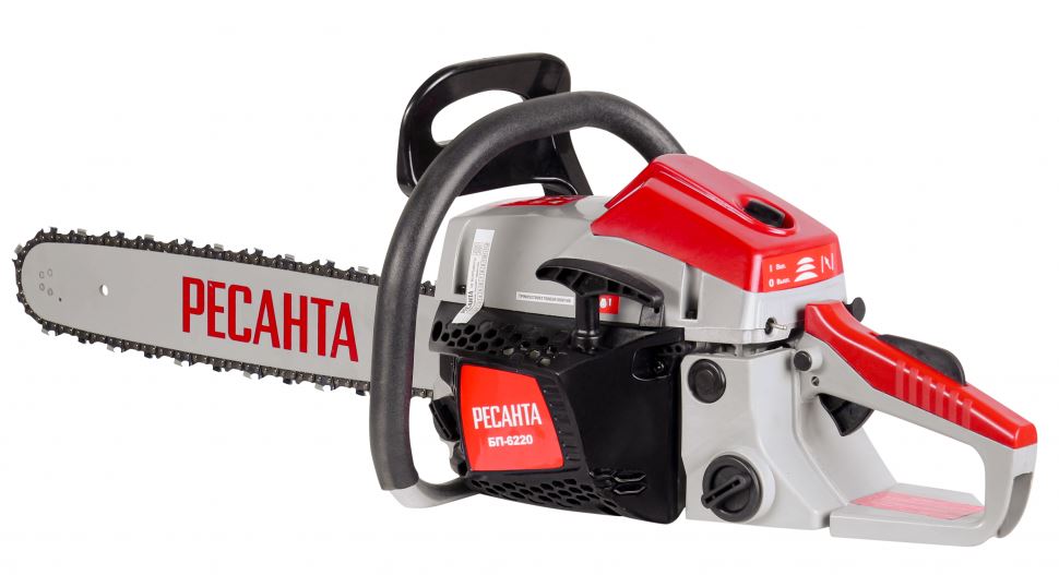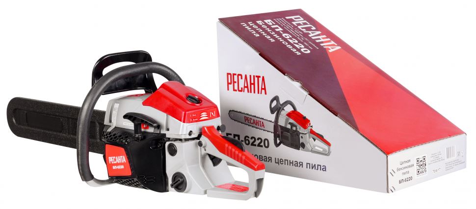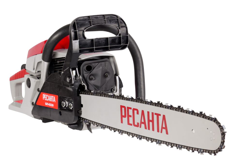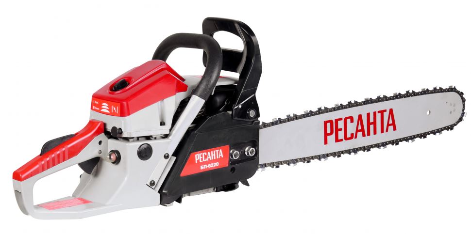 Бензопила БП-6220 Ресанта - мощный инструмент для заготовки дров и валки деревьев. Горизонтальное расположение двигателя дает лучшее распределение массы и делает бензопилу компактной. Обладает высокой точностью реза. Безопасности в этой модели уделено много внимания. Блокировки курка газа предотвращает случайное нажатие. Функция механического инерционного тормоза цепи также важна: при резком отскоке пилы во время пиления (вверх и назад) рука упирается в ручку тормоза и отщелкивает ее, а тормозная лента затягивается и тормозит барабан сцепления, цепь при этом останавливается практически мгновенно. Защитный щиток в случае разрыва цепи или ее соскока с шины предотвращает травмирование. Резиновые амортизаторы, расположенные между рукоятками и картером пилы, снижают вредную вибрационную нагрузку при работе с бензопилой, делают работу комфортнее. Масляный бак размещается в передней части картера. Принудительная смазка цепи и шины применяется для снижения трения между ними, что увеличивает срок службы пильной гарнитуры. Легкий старт влияет на скорость запуска, особенно в зимний период. Он добавляет дополнительный крутящий момент при рывке.