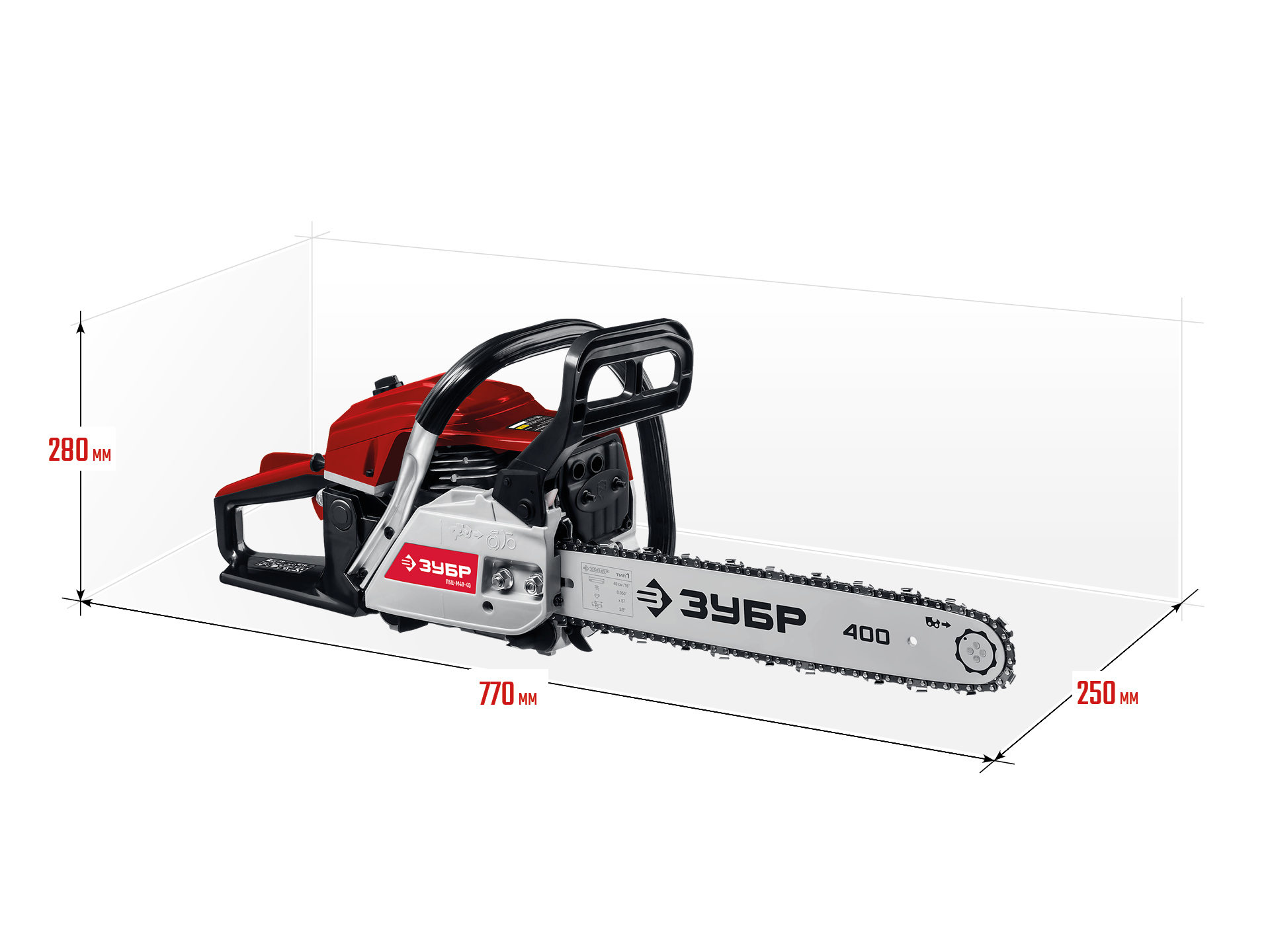Идеальный вариант для пиления досок, бруса, стволов различных пород дерева на дачном участке. В отличие от электрической, бензиновая пила оснащена более мощным двигателем, безопасна в отношении поражения электрическим током, может работать в любую погоду и в любом месте. Функции легкого запуска, автоматической смазки цепи и эффективная антивибрационная защита делают пилу легкой в обращении и комфортной в работе. Двойной тормоз цепи, приводимый в действие при откидывании защитного щитка или при отпускании клавиши блокировки на рукоятке, а также встроенный цепеуловитель и металлический упор делают пилу безопасной в применении. Большая удельная мощность, высокое качество применяемых материалов и изготовления, обеспечивающие увеличенный ресурс, делают бензиновую пилу ЗУБР Вашим лучшим помощником. Обратите внимание, что рекомендуемая пильная гарнитура ЗУБР устанавливается только комплектом