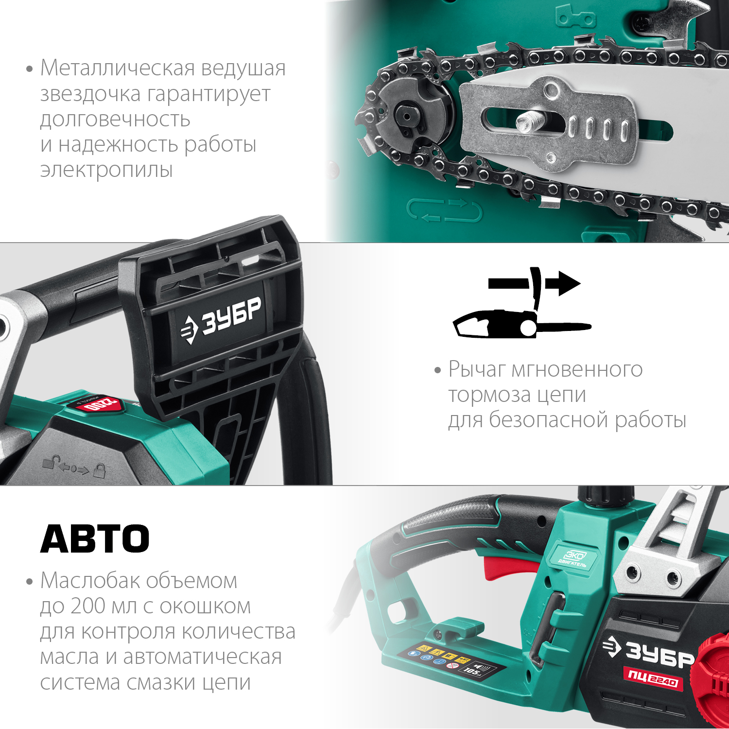 - Автоматическая система смазки цепи дозированно подает масло в зависимости от нагрузки