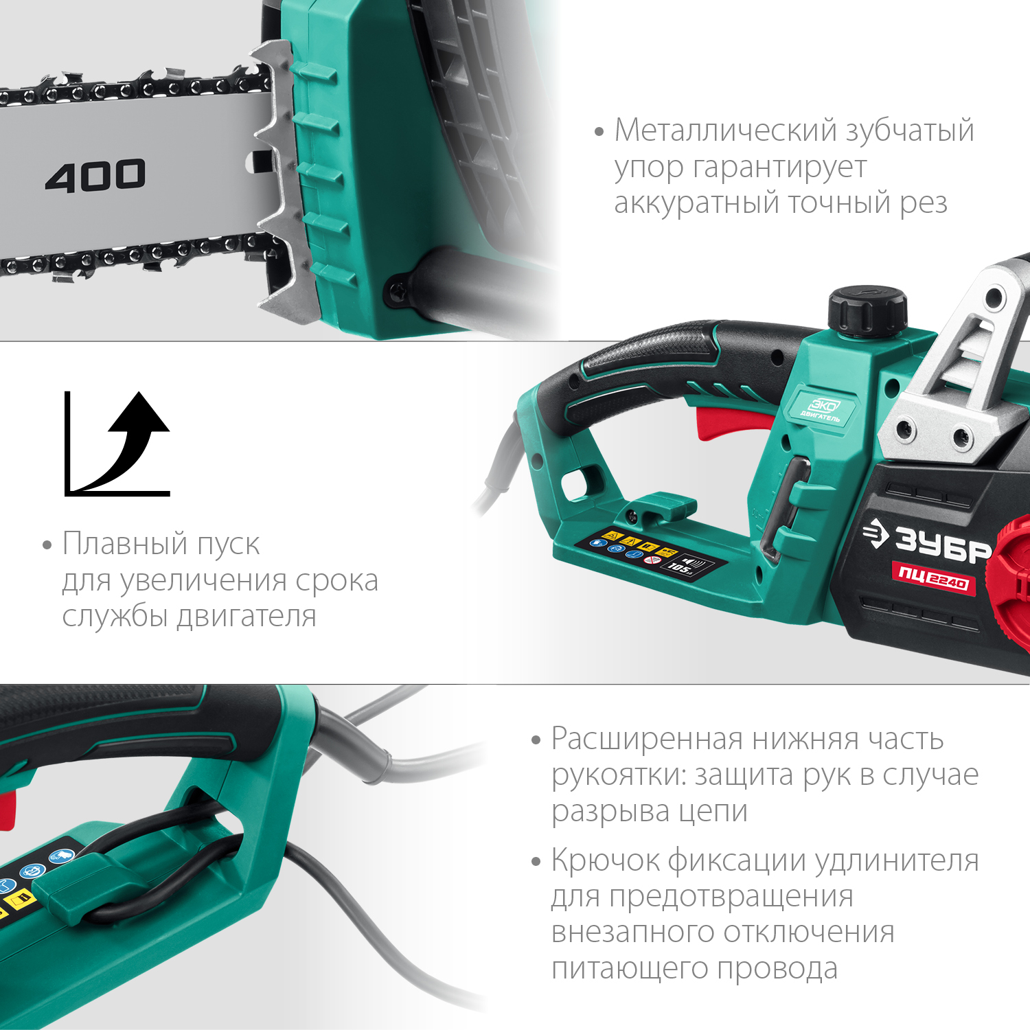- Уловитель цепи и клавиша блокировки включения для дополнительной безопасности