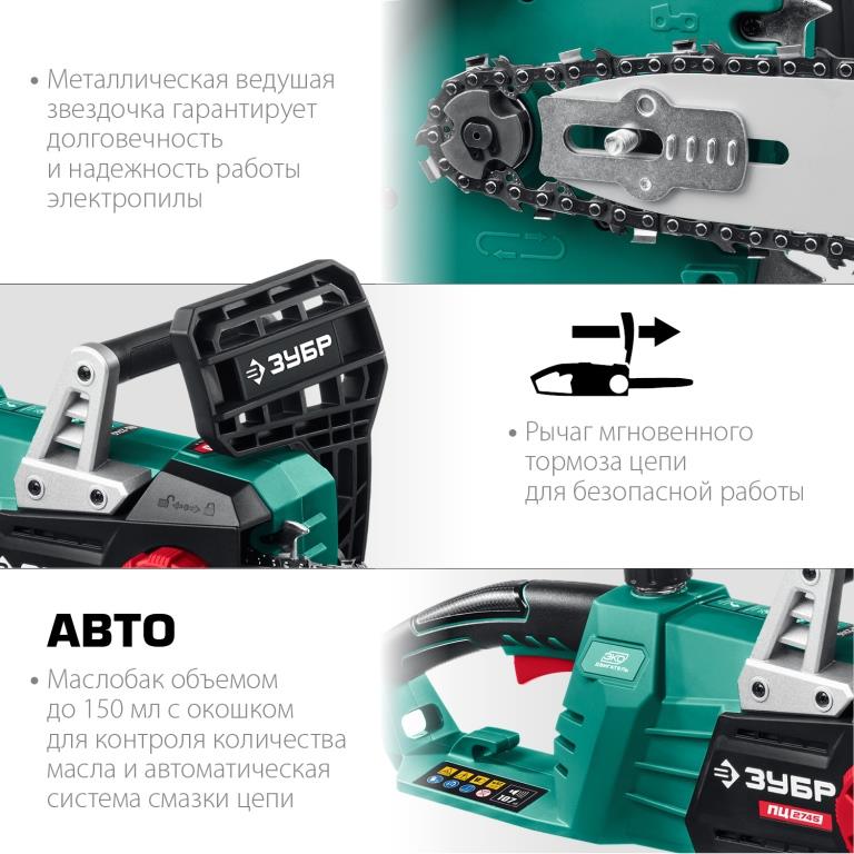 - Автоматическая система смазки цепи дозированно подает масло в зависимости от нагрузки