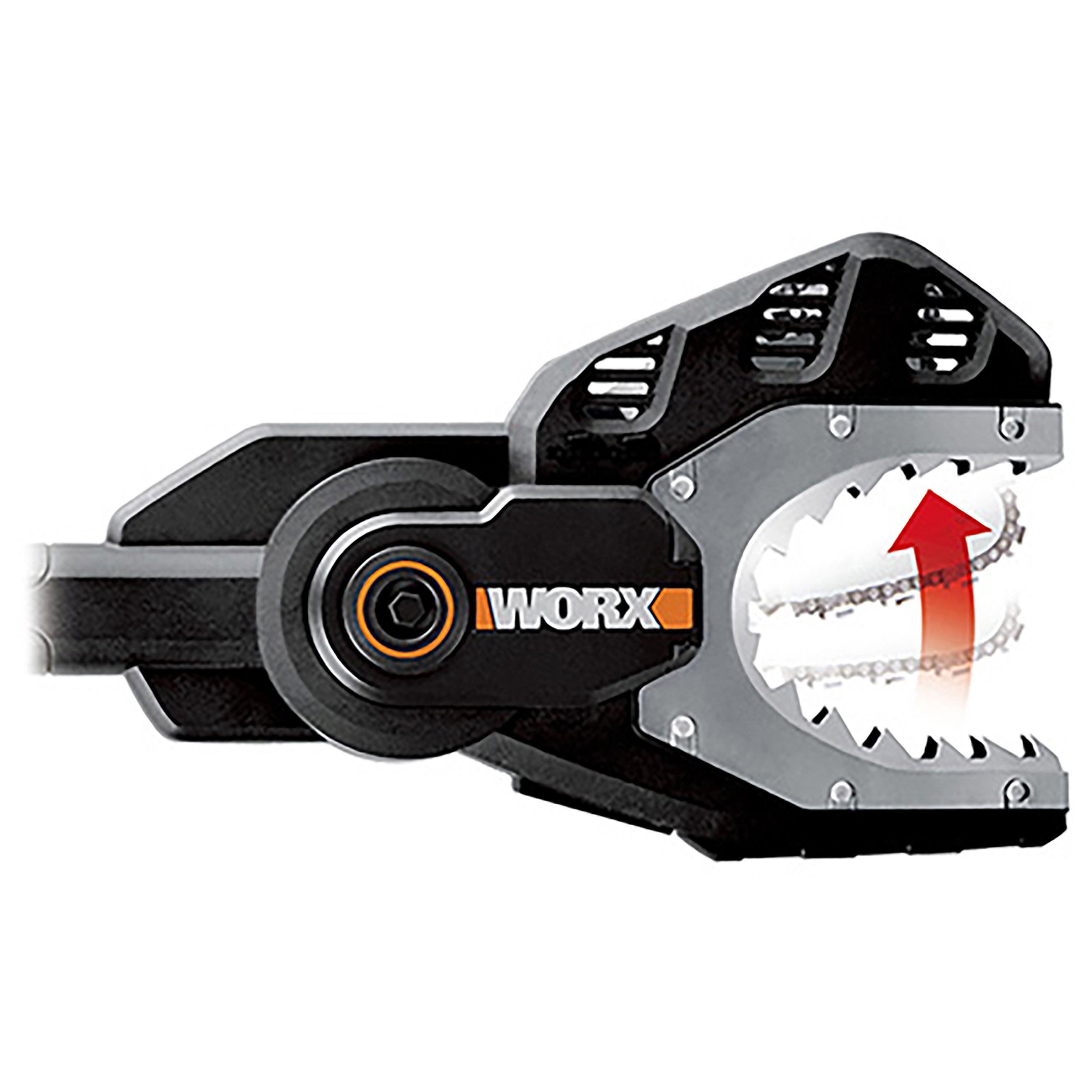 Серия цепных пил WORX JawSaw — это единственная запатентованная пильная система, имеющая захват со стальными зубьями и установленной внутри пильной шиной. Стальные зубья удерживают ствол древесины до 10 см в диаметре, что упрощает работу с толстыми ветвями деревьев, а также позволяет работать на плоских поверхностях в вертикальном положении устройства. Пильная шина выезжает из защитного верхнего кожуха при нажатии кнопки пуска и снятии защитного ключа. Данный механизм делает JawSaw самой безопасной пилой из уже имеющихся.