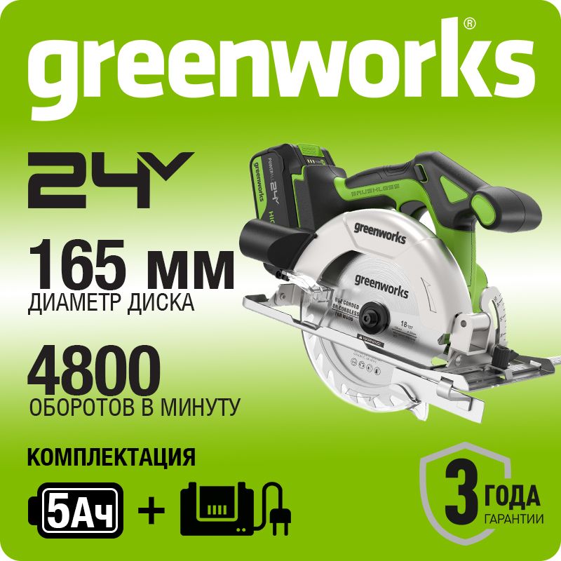 - Дисковая пила Greenworks GD24CS165 построена на основе производительного и надёжного бесщёточного двигателя DigiPro™, который эффективно использует энергию аккумулятора и не теряет мощность под нагрузкой, обеспечивая неизменно высокую скорость реза.