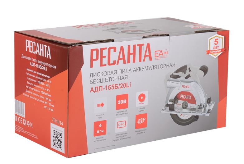 Дисковая пила аккумуляторная бесщеточная АДП-165Б/20Li (в комплекте 1 АКБ и ЗУ) ЕА+ Ресанта