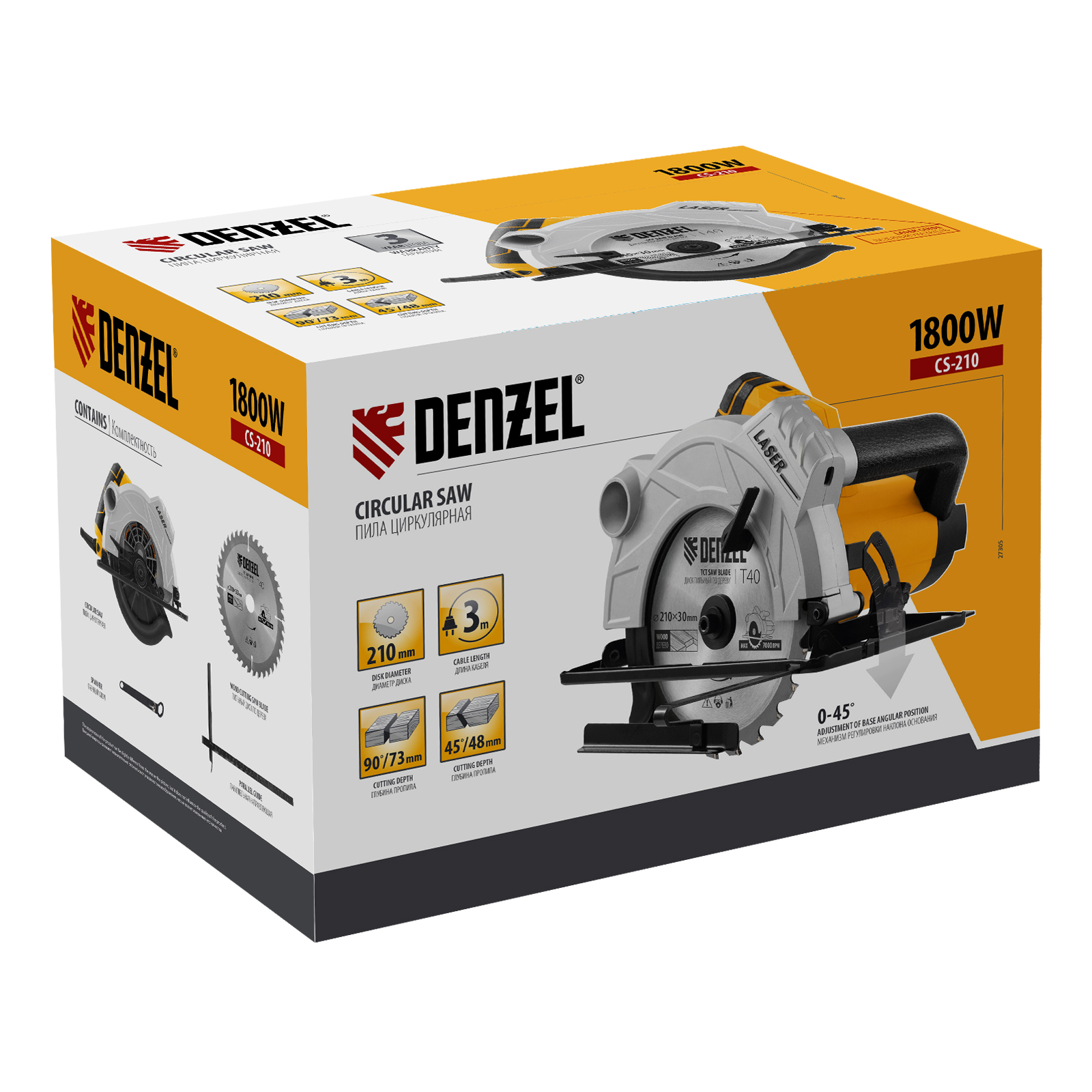 Циркулярная пила Denzel CS-210 27305 — мощная и производительная, имеет максимальную глубину реза в линейке Denzel CS — 73 мм, что обеспечивает эффективную работу с досками, фанерой, ДСП и другими листовыми древесными материалами.