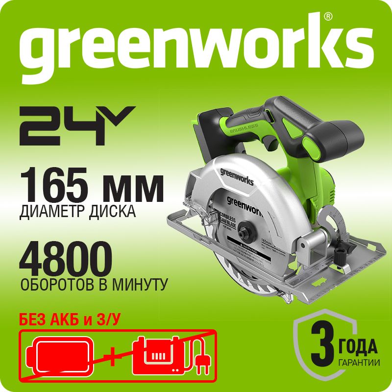 - Дисковая пила Greenworks GD24CS165 построена на основе производительного и надёжного бесщёточного двигателя DigiPro™, который эффективно использует энергию аккумулятора и не теряет мощность под нагрузкой, обеспечивая неизменно высокую скорость реза.