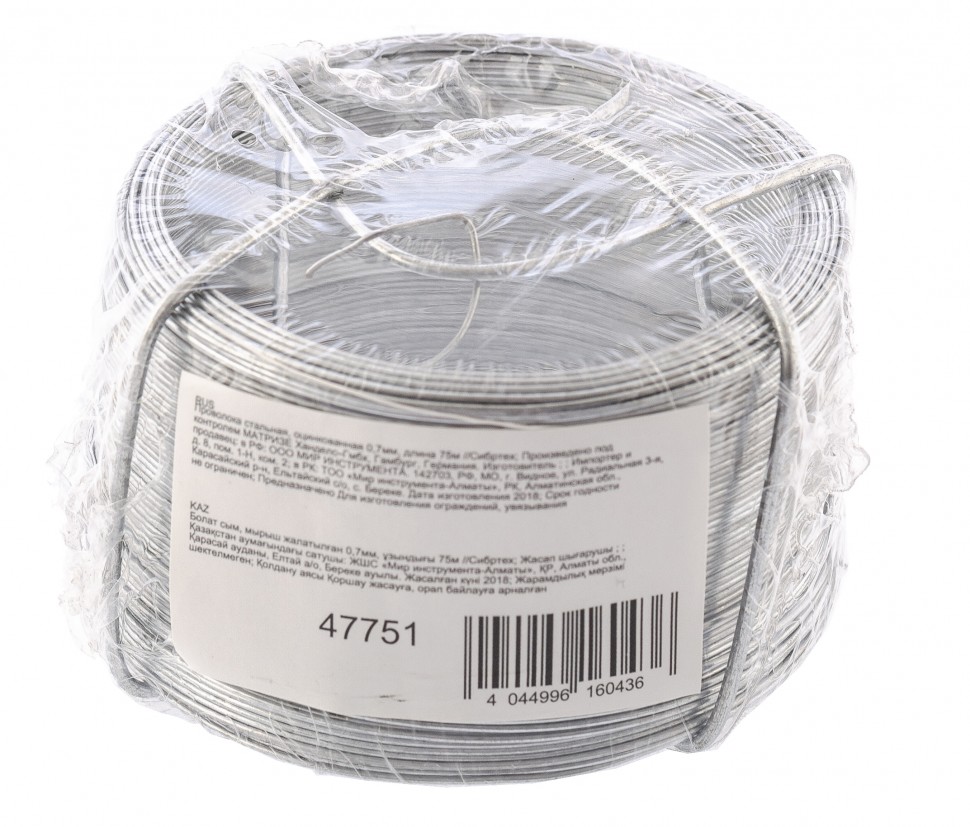 Стальная оцинкованная проволока Сибртех 47751 диаметром 0,7 мм и длиной 75 м используется для фиксации и связывания грузов, создания растяжек. Пригодится во время такелажных работ, будет полезна для занятий рукоделием и решения бытовых задач.