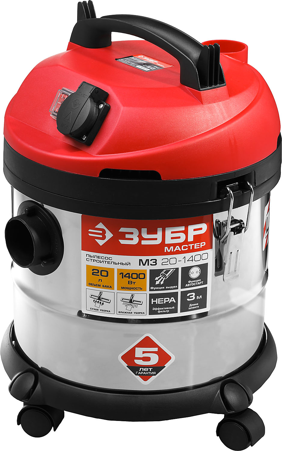 Строительный пылесос ЗУБР предназначен для уборки помещений, а также для принудительного удаления продуктов пиления, строгания, фрезерования и т.п. из рабочей зоны электроинструмента. Он незаменим для поддержания чистоты в гараже, мастерской, удаления мусора во время ремонта в квартире или на даче. Бак из нержавеющей стали объемом 20 л очень долговечен. а синхронное включение с инструментом, подключенным через розетку пылесоса позволит сохранить чистоту на рабочем месте.