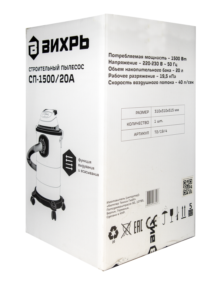 Строительный пылесос Вихрь СП-1500/20А предназначен для сухой и влажной уборки помещений, а также для совместного использования с электроинструментом при принудительном удалении продуктов строгания, пиления.