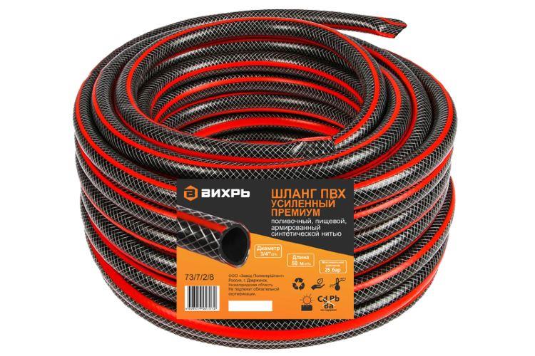 Шланг Вихрь поливочный усиленный, премиум качества предназначен для полива земельных участков, газона и других подобных поверхностей. Шланг выполнен из высококачественного ПВХ-материала, армированного трёхслойной нейлоновой нитью. Данная модель шланга является лучшей в своём классе. Выдерживает давление до 25 бар.