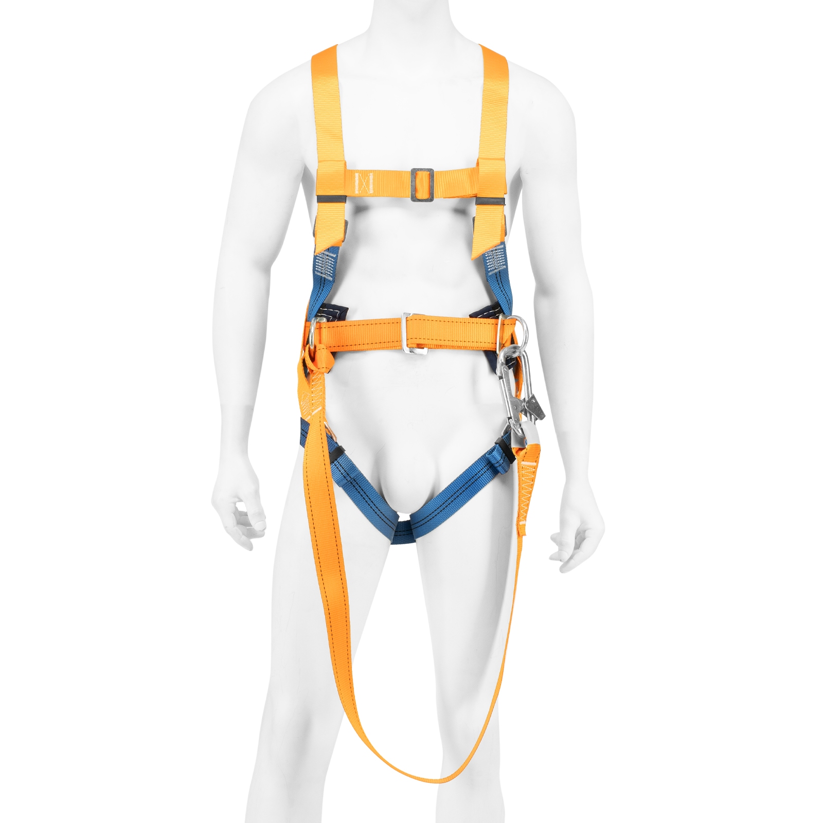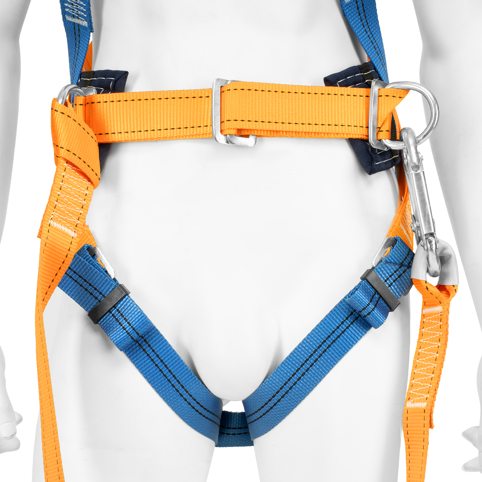 - Надежное крепление — привязь имеет 2 прочных D-кольца на поясном ремне и одно на спине, а также большой монтажный карабин.